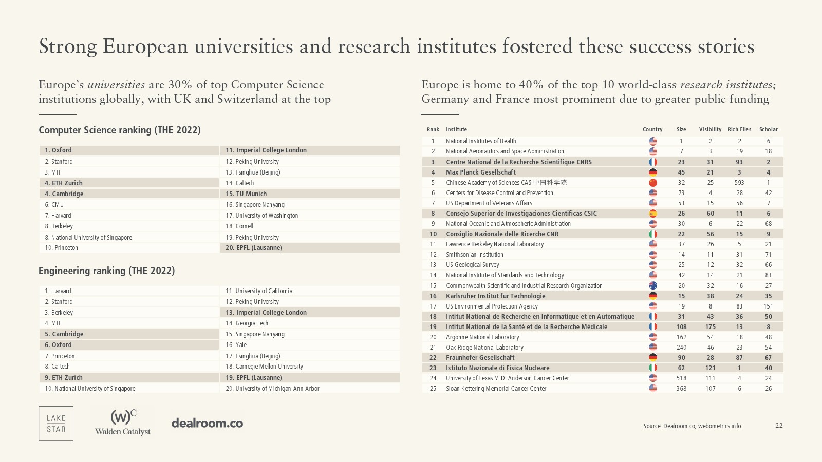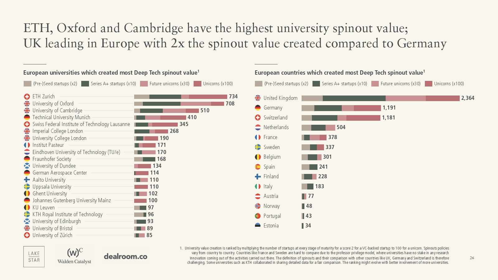 深度科技中心正在兴起:斯德哥尔摩(32亿美元巨额融资)、伦敦(15亿美元)、巴黎(15亿美元)、格勒诺布尔(12亿美元)和慕尼黑(7亿美元)。