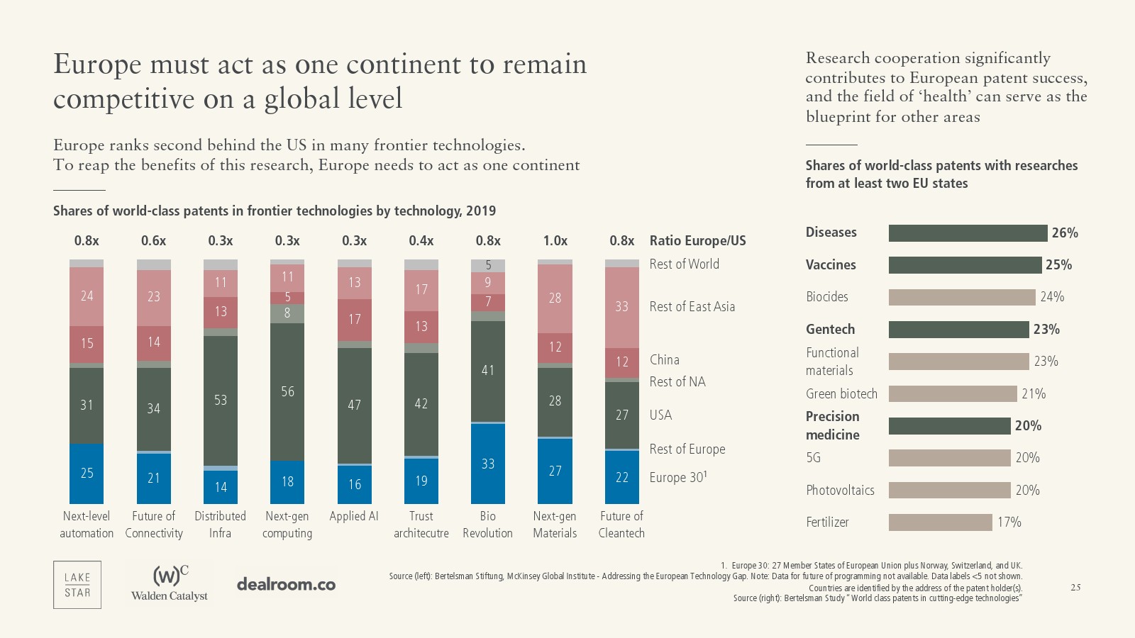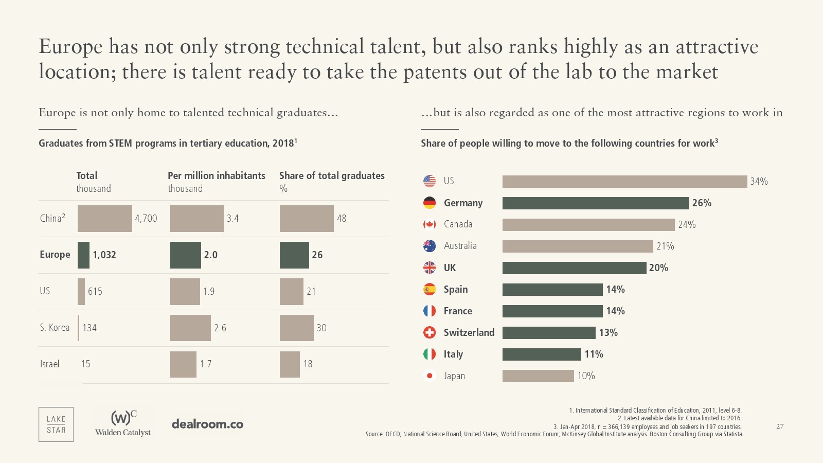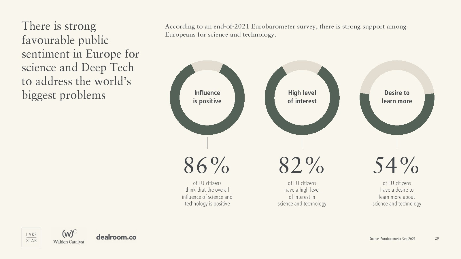 欧洲具备成为全球深度技术卓越中心的条件:其具备强大的基础研究,拥有众多受过良好教育的人才,比以往任何时候都更多的公众支持,以及积极的公民情绪。90%的欧洲人认为科学和技术的整体影响是积极的。