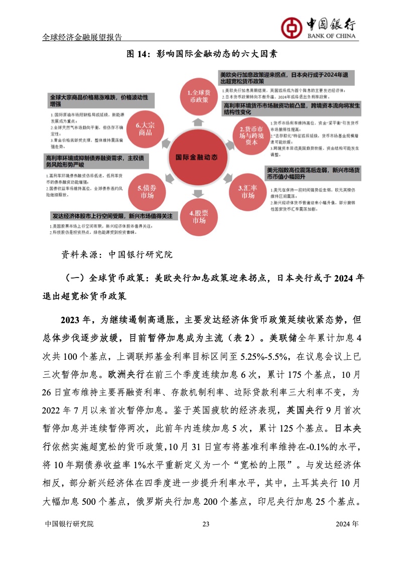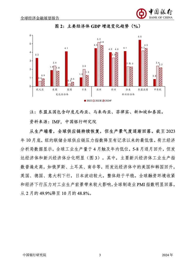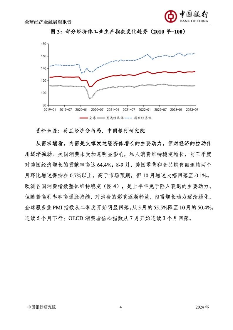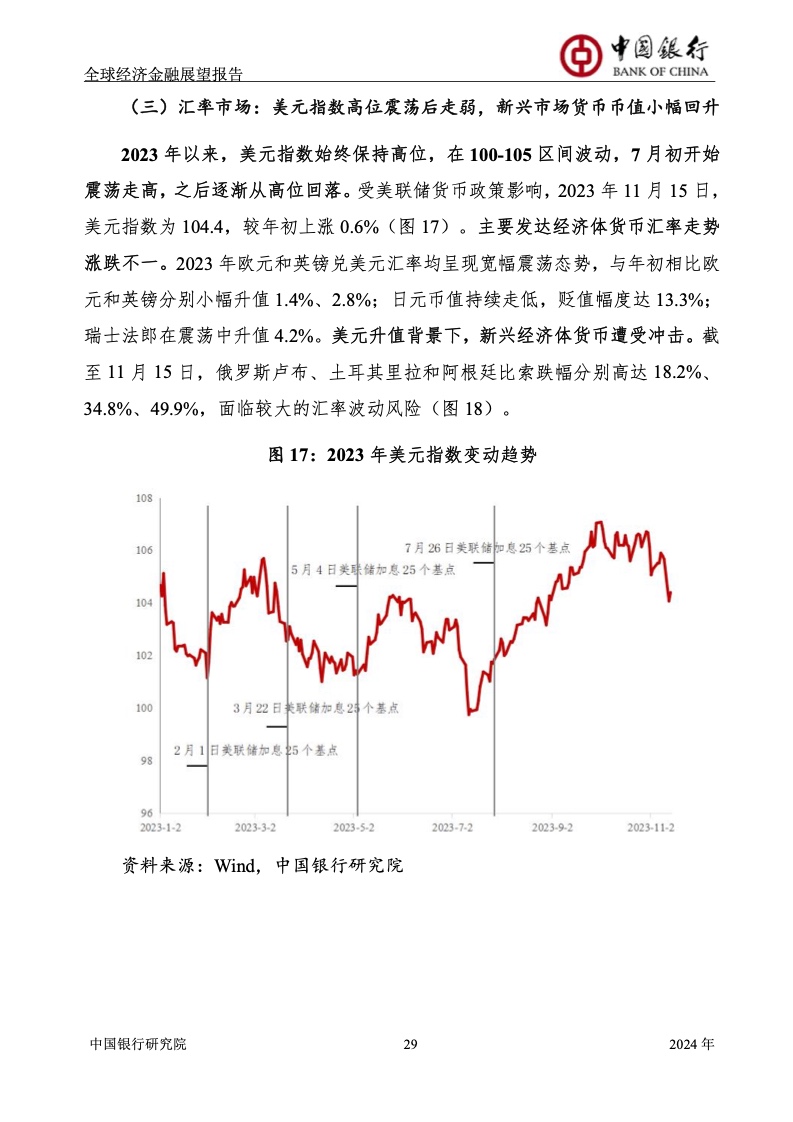 《报告》认为,2023年全球经济增长动力不足,发达经济体增速放缓,新兴经济体整体表现稳定。全球贸易增长略显乏力,各国生产景气度逐渐回落,内需对经济的拉动作用减弱。欧美央行货币政策紧缩态势放缓,美元指数高位震荡后走弱,全球股市表现总体好于预期,但区域分化明显。
