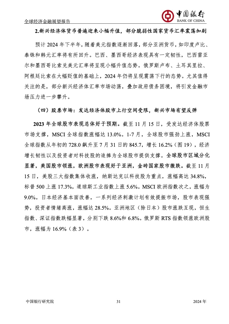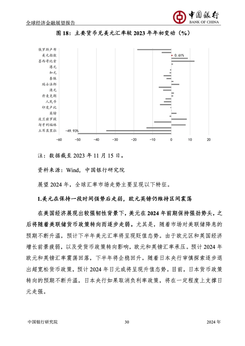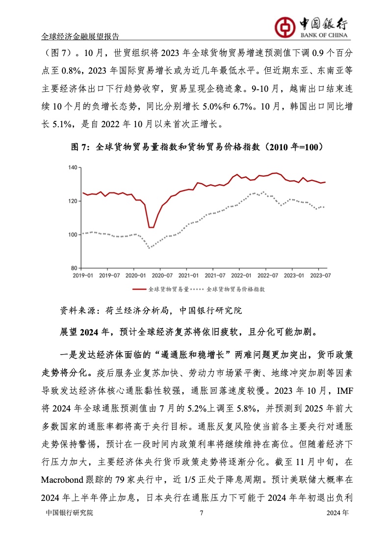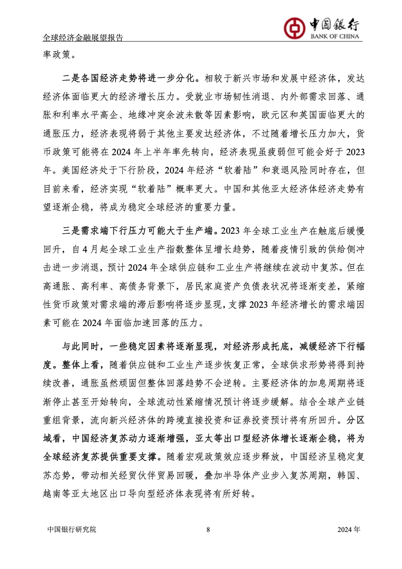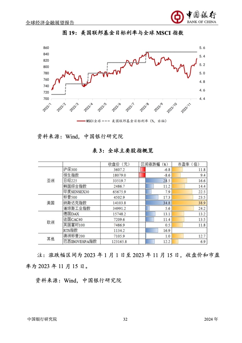 《报告》认为,2023年全球经济增长动力不足,发达经济体增速放缓,新兴经济体整体表现稳定。全球贸易增长略显乏力,各国生产景气度逐渐回落,内需对经济的拉动作用减弱。欧美央行货币政策紧缩态势放缓,美元指数高位震荡后走弱,全球股市表现总体好于预期,但区域分化明显。