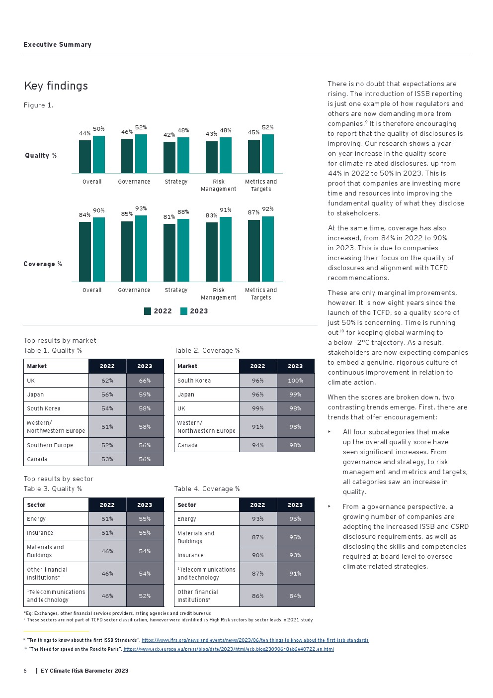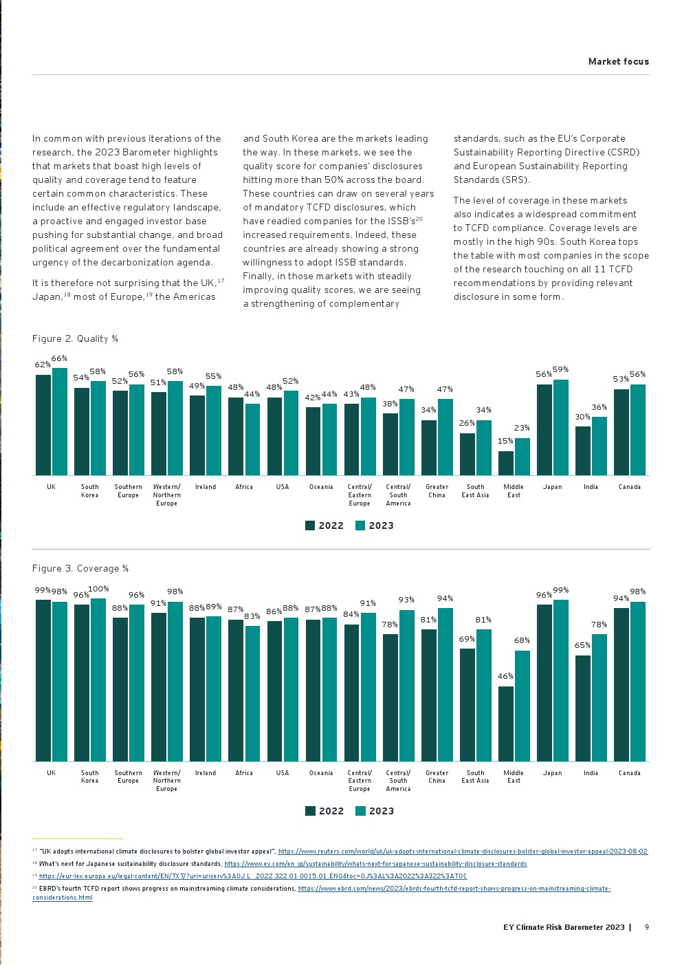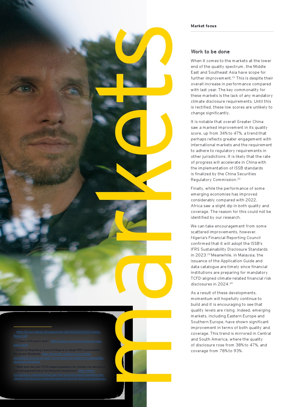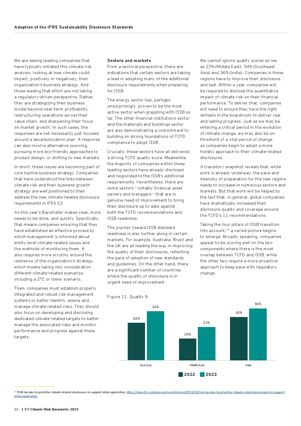好消息是信息披露继续朝着正确的方向发展,从2022年的84%增加到2023年的90%。气候信息披露的质量仍然很低,仅为50%,由于需要为新的国际可持续发展标准委员会(ISSB)法规的要求做好准备,才有了渐进式的改善(同比增长6%)。