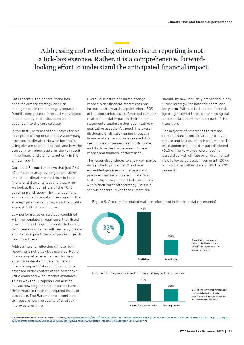 在考察与企业绩效的关系时,只有1/3的受访公司在其财务报表中披露了与气候相关的影响之间的定量或定性联系,这表明气候风险和影响在财务绩效中没有得到平等考虑。