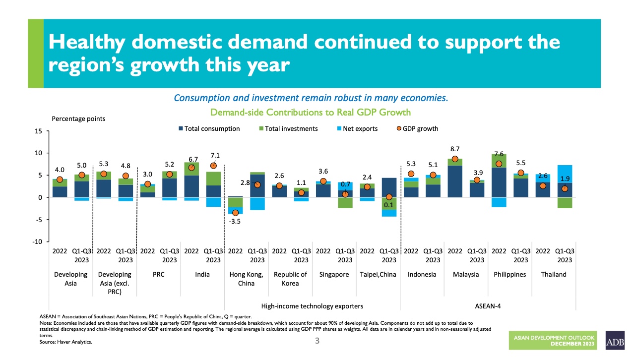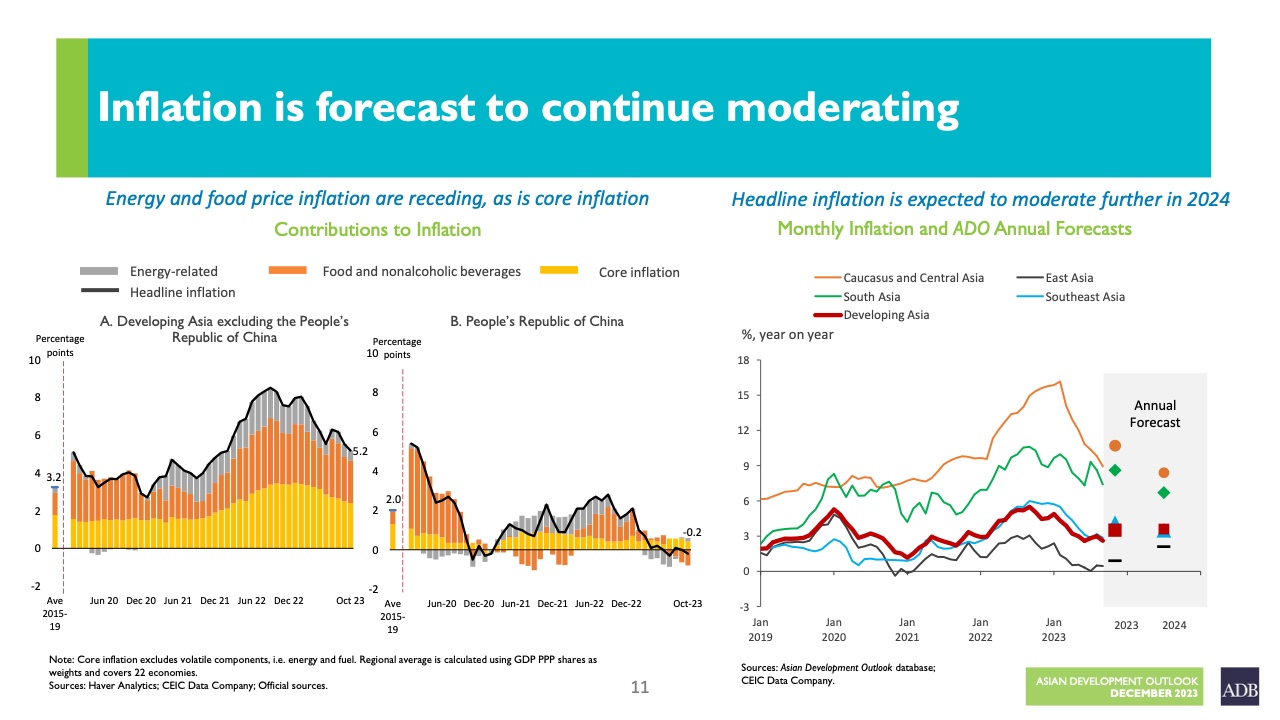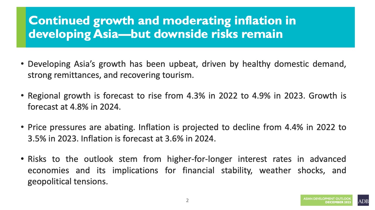 亚行首席经济学家朴之水(Albert Park)表示,尽管全球环境充满挑战,但亚洲发展中经济体仍然保持了强劲的增长势头。与此同时,本地区的通胀问题逐渐得到了控制。然而,无论是全球利率居高不下还是厄尔尼诺等气候事件等风险依然存在。因此,亚太各国政府需要持续保持警惕,确保经济具备足够的韧性和可持续性。