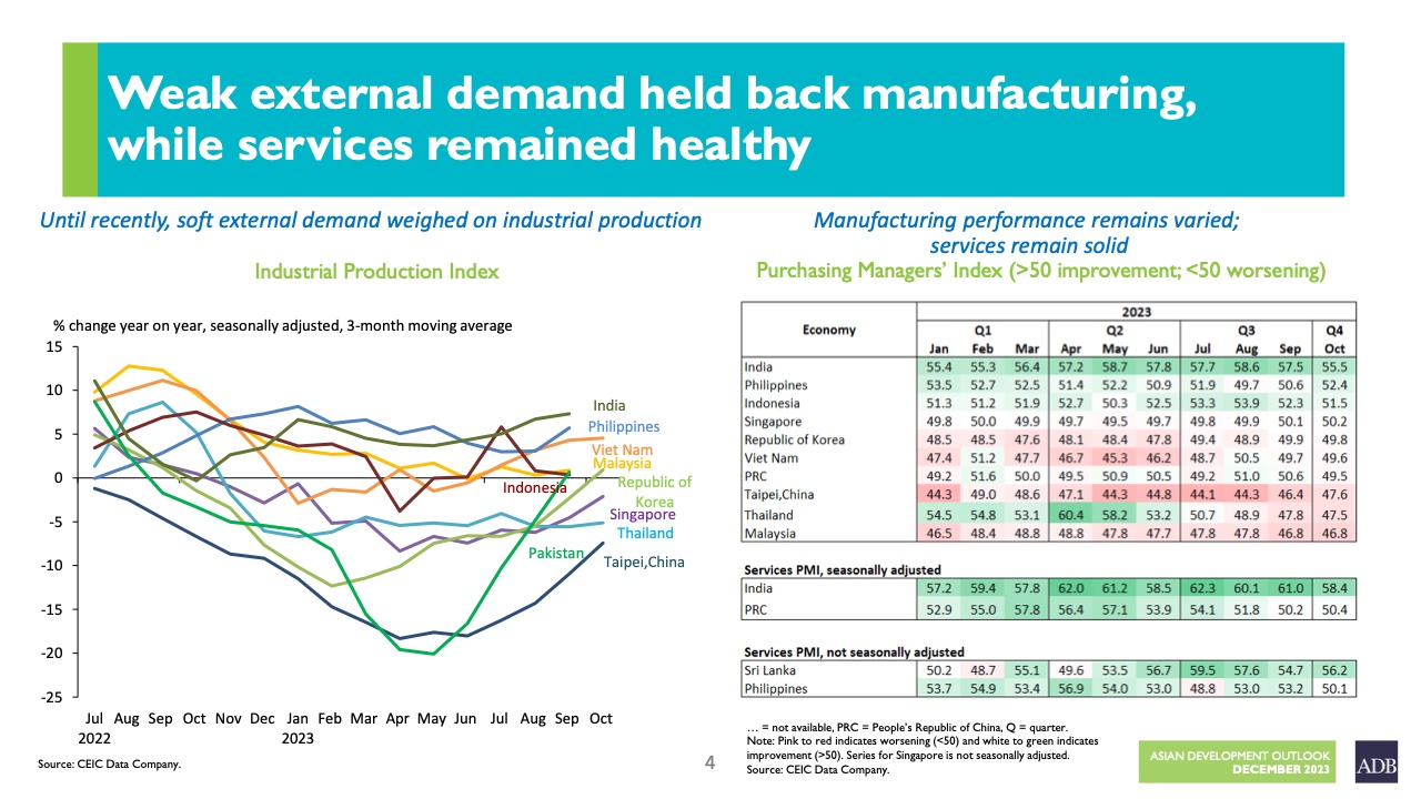 鉴于第三季度居民消费和公共投资的刺激,预计中国经济今年将增长5.2%,高于之前的预测值4.9%。同时,在工业实现两位数增长的推动下,印度7月至9月的增速超过预期,亚行将其增长前景预测从6.3%上调至6.7%。对于中印两国的预测上调足以抵消东南亚制造业表现平平而导致的预测下调。