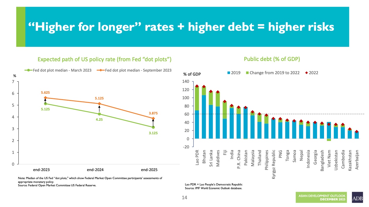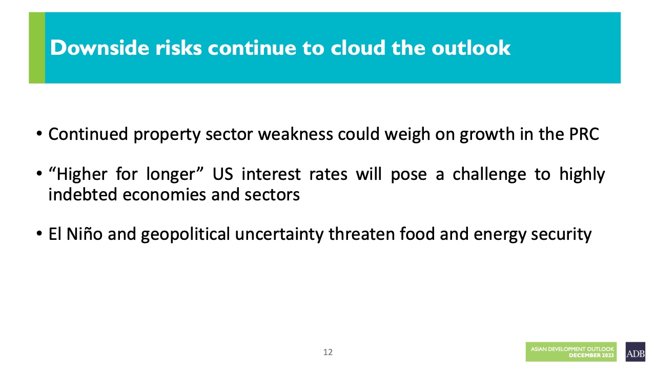 本地区经济前景面临的风险包括美国和其他发达经济体继续保持高利率水平,可能导致本地区脆弱经济体特别是高负债经济体面临金融不稳定。此外,厄尔尼诺天气模式或俄乌冲突可能导致供应中断,再次引发通胀,特别是粮食和能源价格上涨。