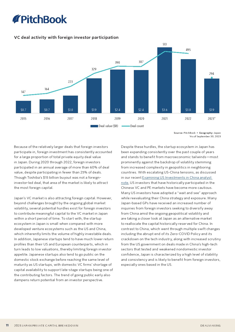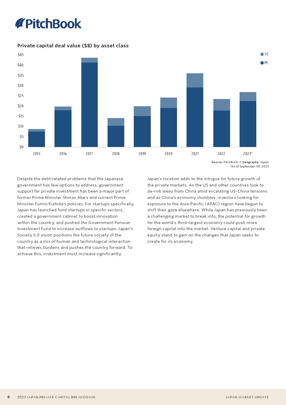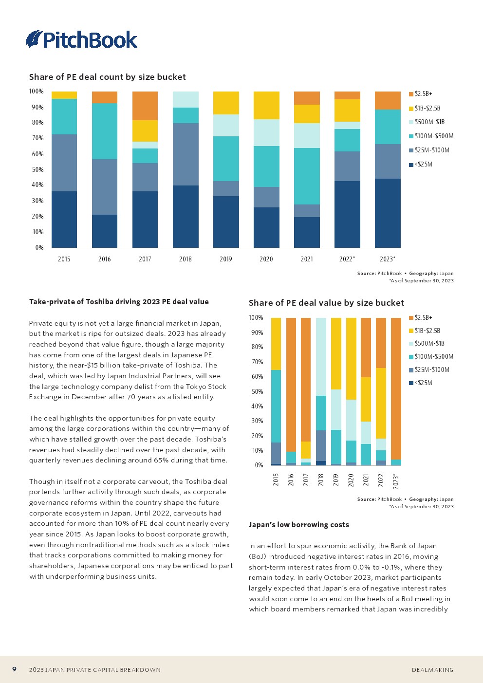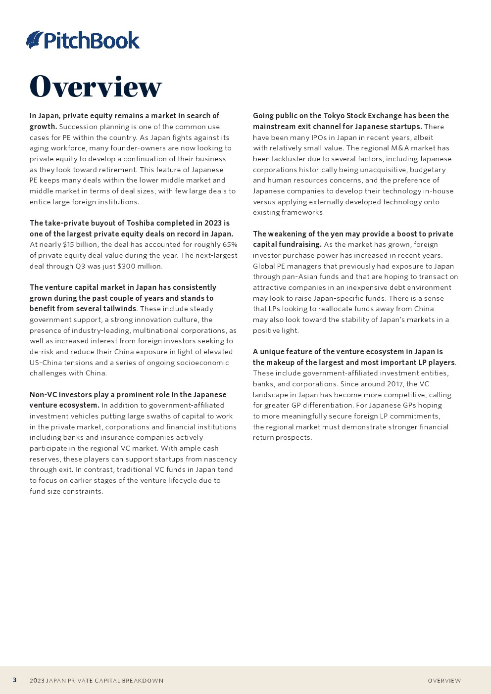 东芝于2023年完成的私有化收购是日本有史以来规模最大的私募股权交易之一。这笔交易接近150亿美元,约占今年私募股权交易总额的65%。第三季度的第二大交易仅为3亿美元。