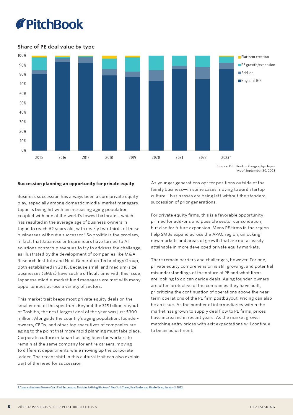 在日本,私募股权仍是一个寻求增长的市场。继任计划是日本国内PE的常见用例之一。在日本努力应对劳动力老龄化问题之际,许多创始人和所有者现在都在寻求私募股权投资,以在他们准备退休之际继续发展自己的业务。就交易规模而言,日本私募股权的这一特点使许多交易处于中低端市场和中等市场,很少有大型交易能够吸引大型外国机构。