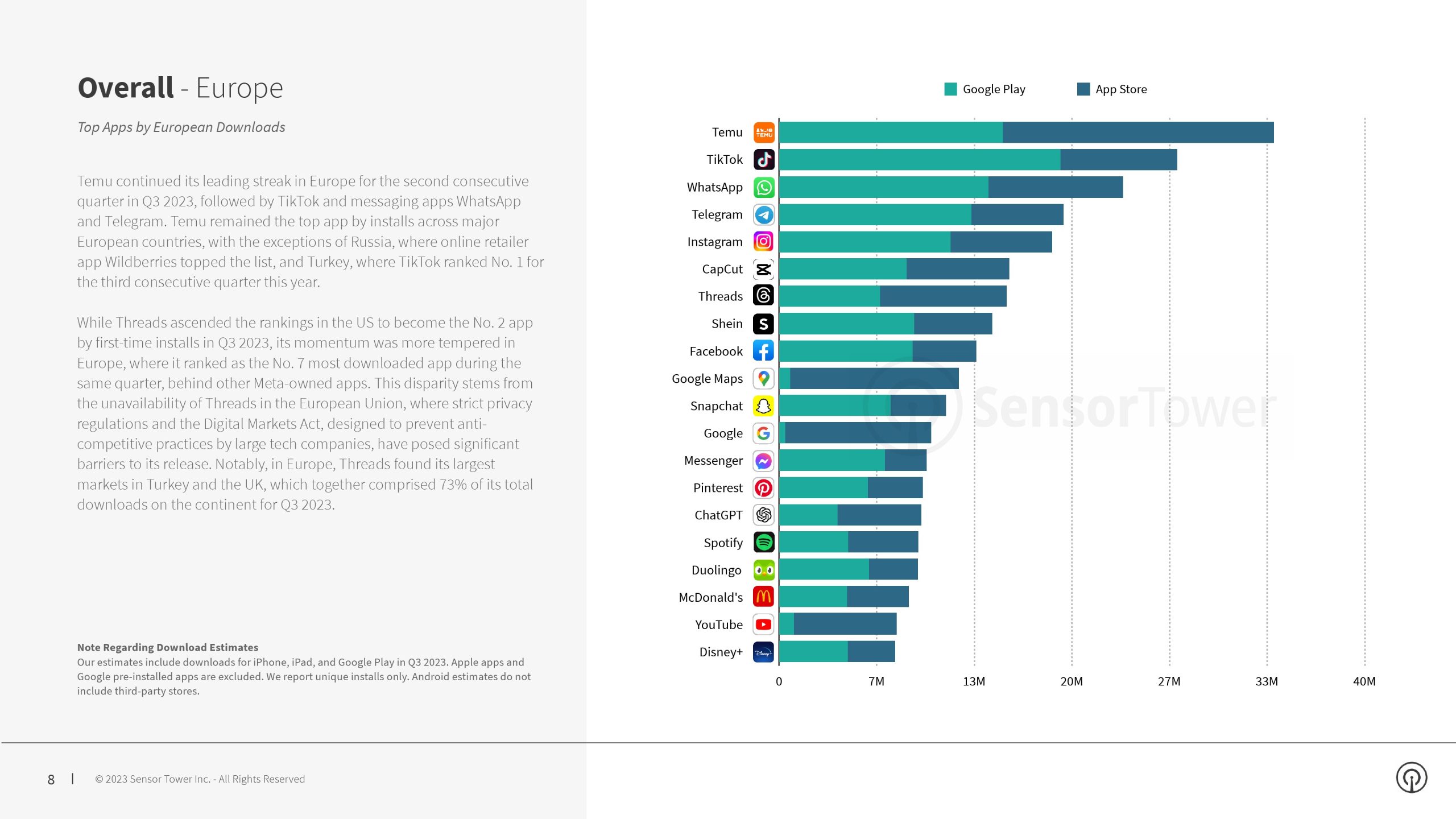 Instagram在2023年第三季度巩固了其全球最受欢迎应用的统治地位。成立于2023年7月的Threads在同一季度迅速攀升至前五名。自推出以来,购物应用Temu的下载量环比增长迅速,在美国和欧洲市场继续保持领先地位。