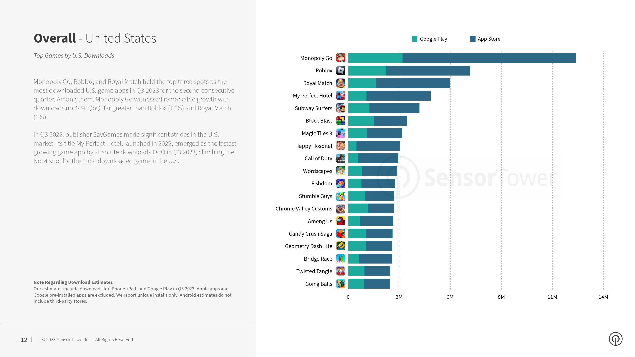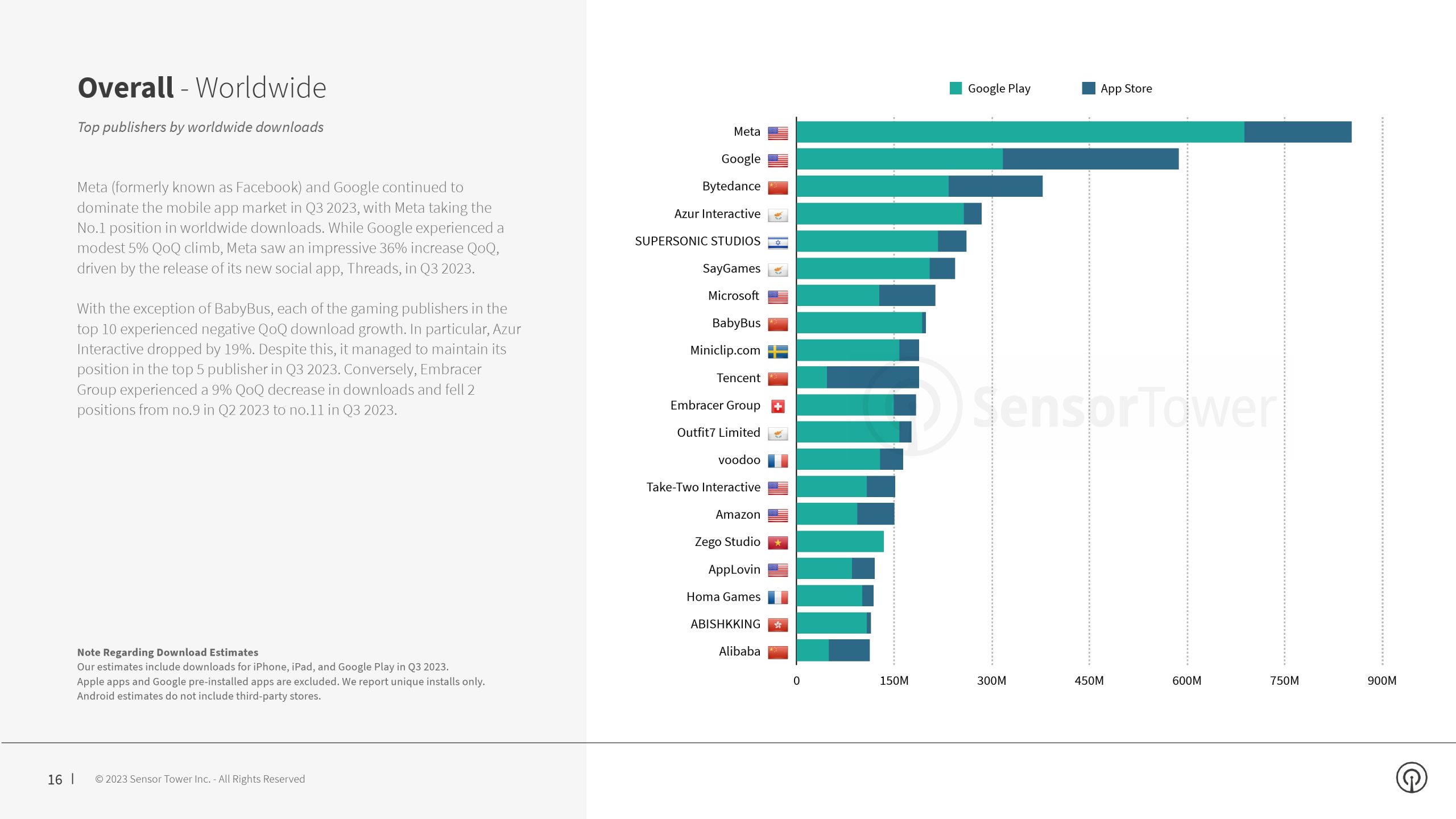 2023年第三季度,顶级发行商的下载趋势发生了显著变化。虽然Meta和Google继续在全球占据主导地位,但游戏领域却呈现出一幅对比鲜明的画面,即主要玩家的季度下载量呈现负增长,这表明用户粘性和偏好发生了转变。