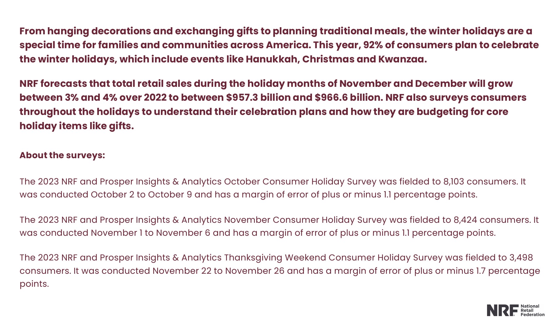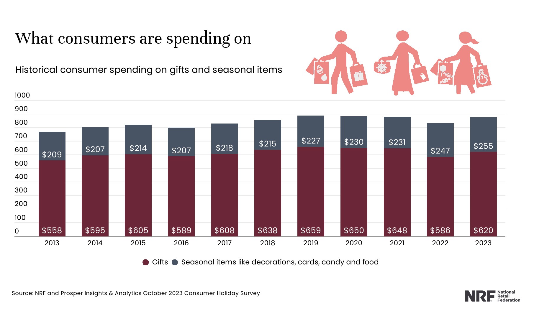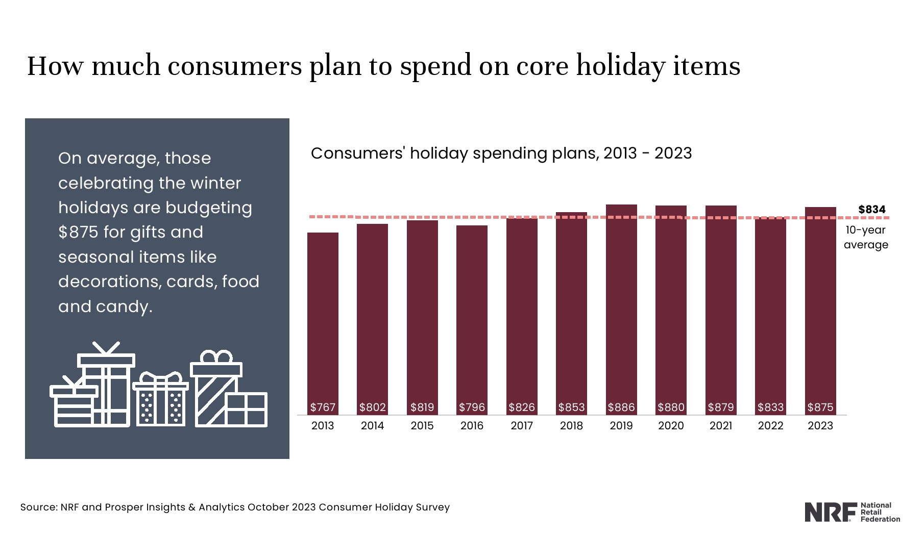 根据最新的消费者调查,那些庆祝2023年假日的美国人预计在礼物、装饰品、食品和其他关键季节性物品上平均花费875美元。这比2022年的支出多了42美元,与过去五年的平均预算一致。