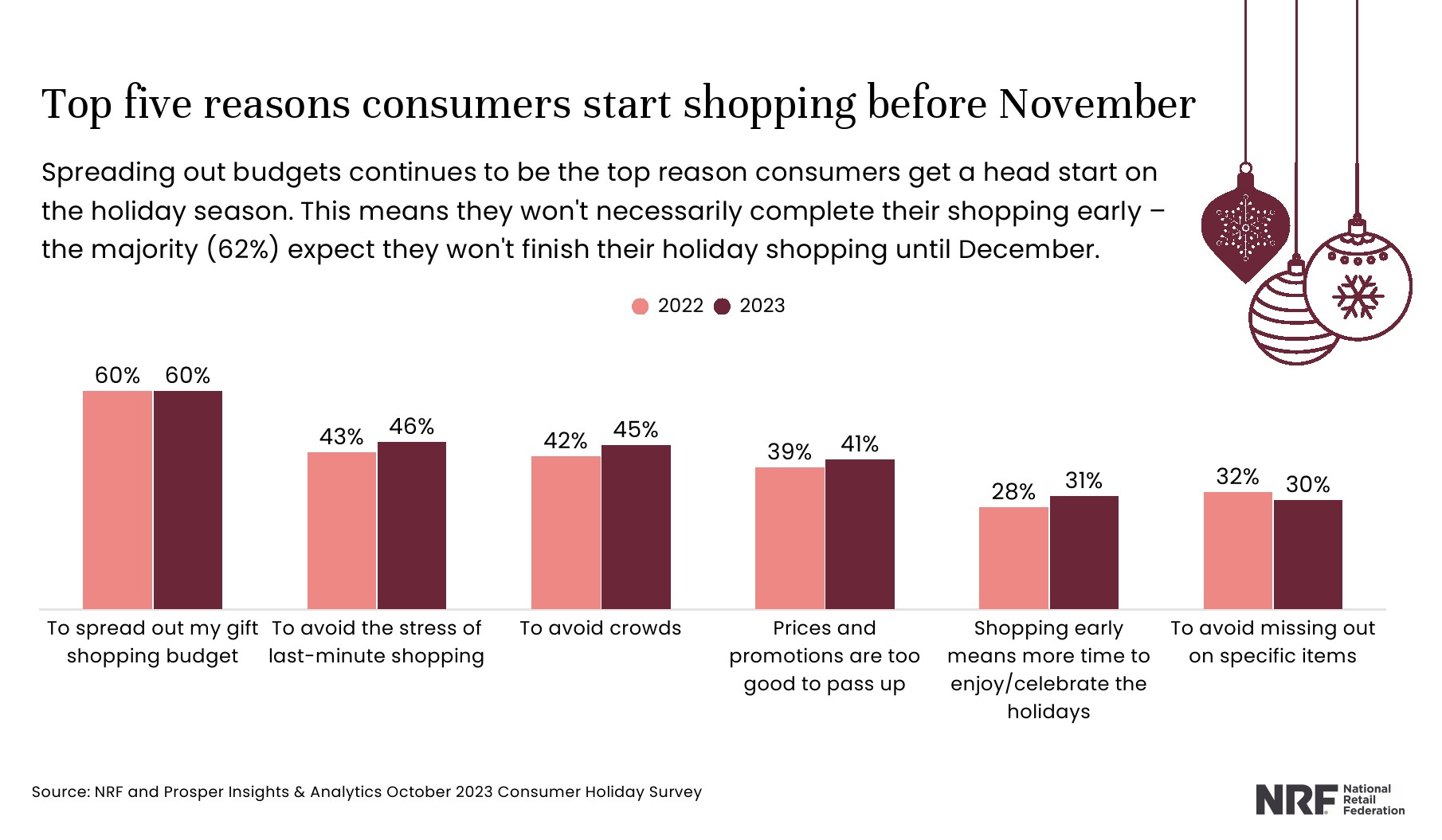 即使消费者在假期的预算比去年多,他们也在寻找充分利用预算的方法。在购买礼物时,62%的消费者表示今年的销售和促销对他们来说比去年更重要。约1/3的人(36%)表示,他们正在削减其他方面的开支,以支付节日用品的费用;30%的人为更少的人购买礼物;另有27%的人减少了为自己购买礼物的支出。