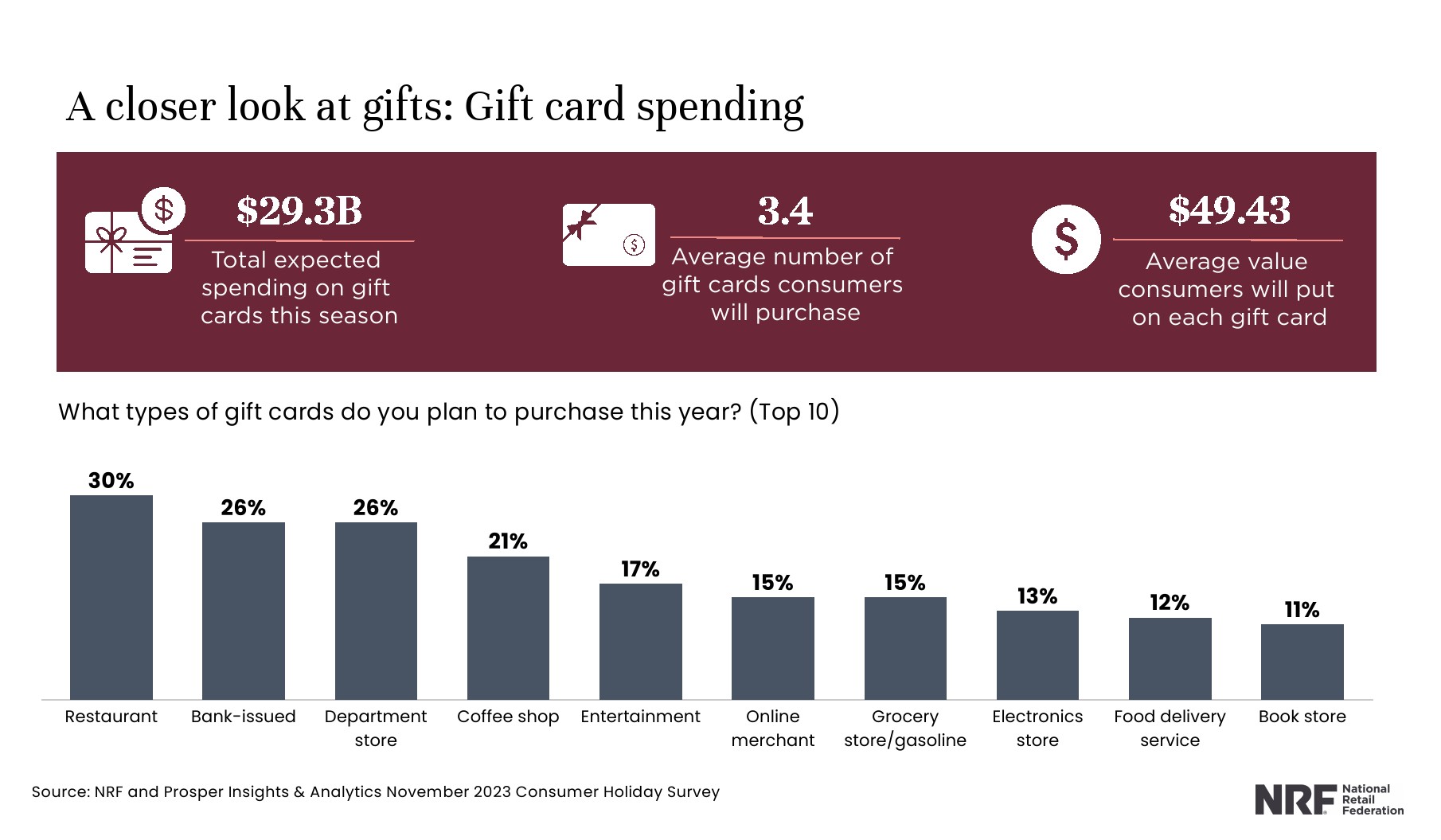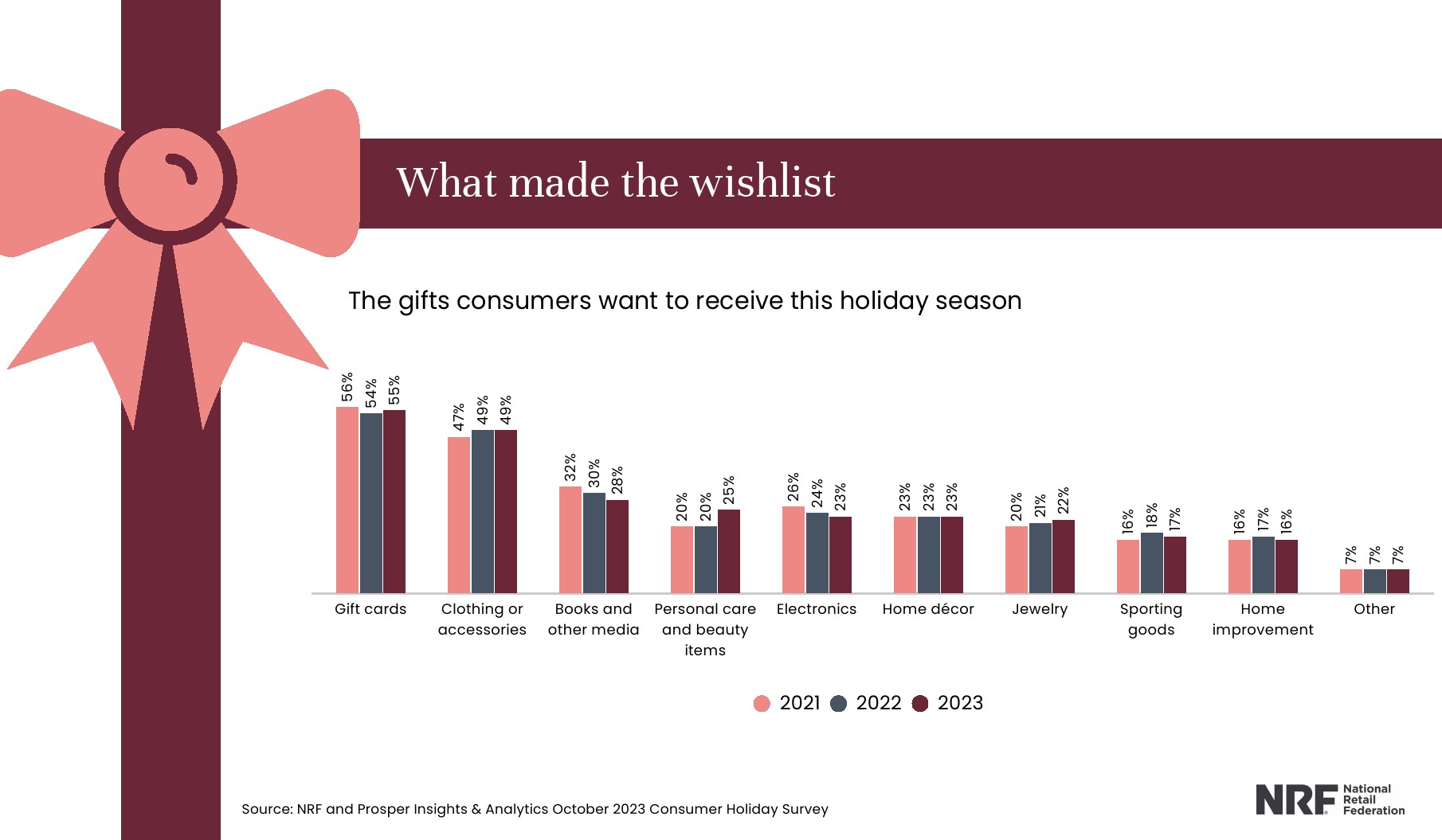礼品卡仍然是最受欢迎的礼物,55%的假日购物者今年希望收到礼品卡,其次是服装或配饰(49%),书籍、视频游戏或其他媒体(28%),以及个人护理或美容用品(25%)。