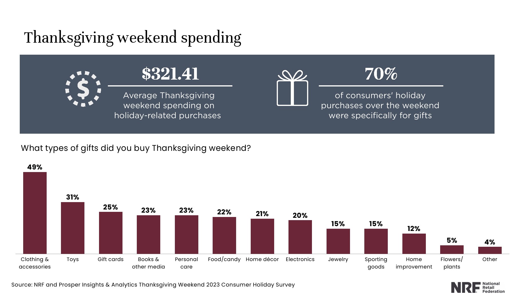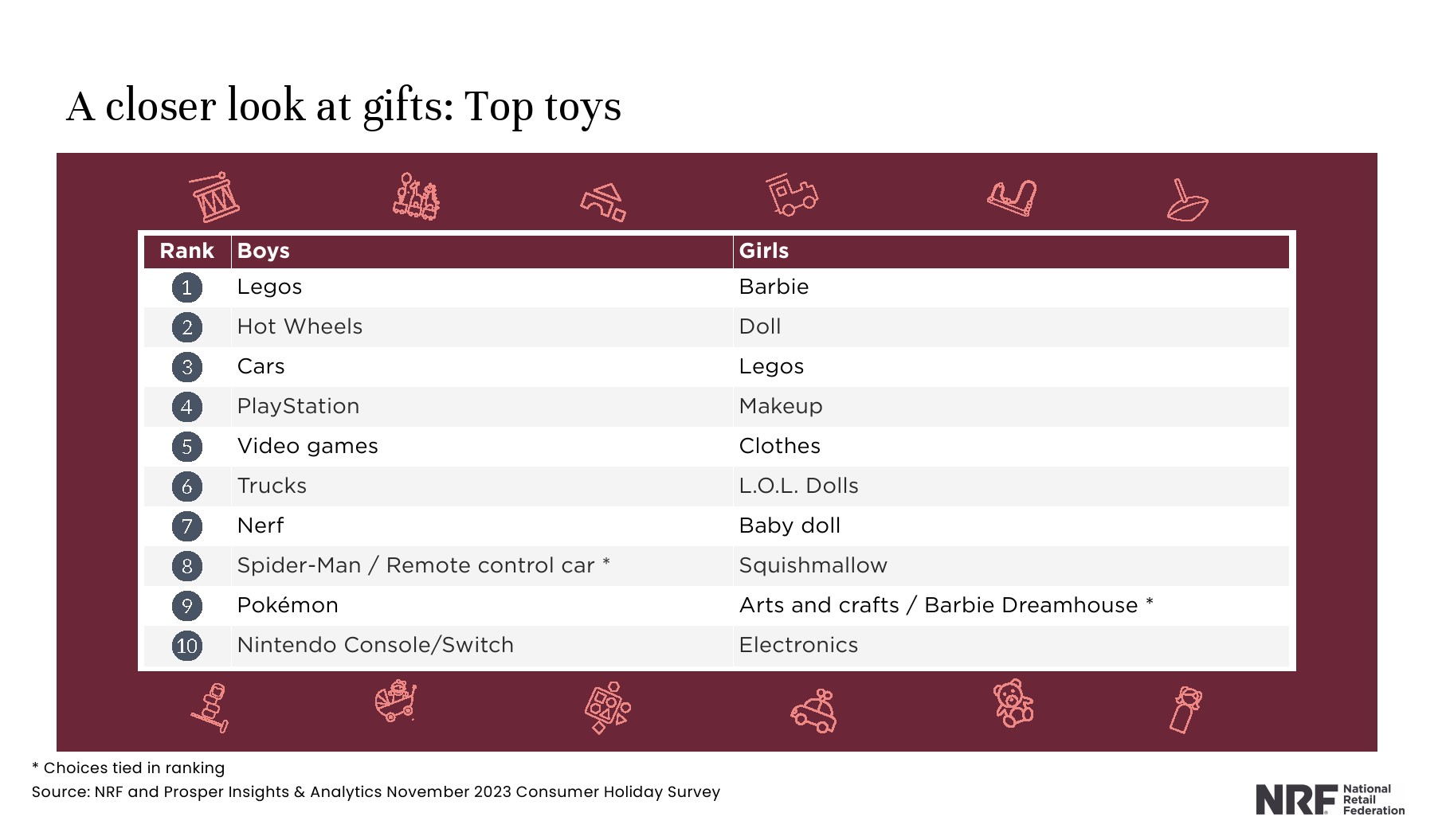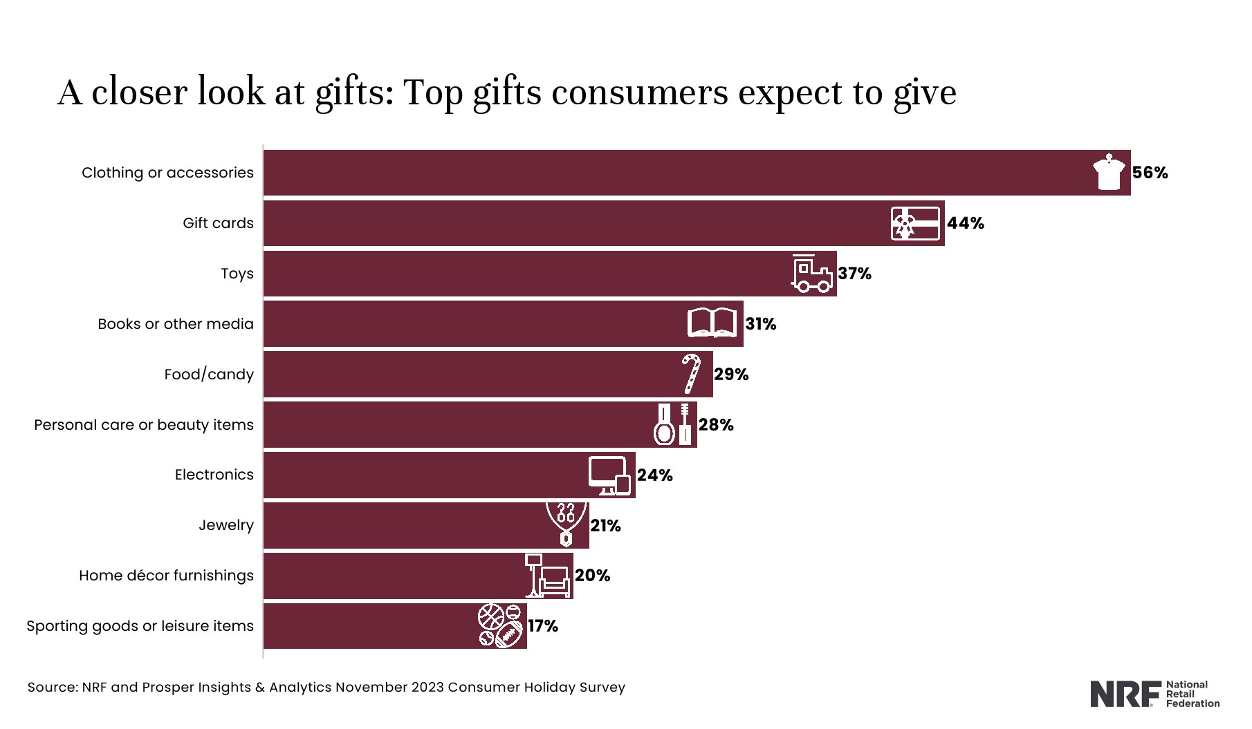 消费者计划赠送的前五大礼物类别是服装(56%),其次是礼品卡(44%),玩具(37%),书籍、视频游戏和其他媒体(31%),以及食品/糖果(29%)。创纪录的28%的消费者打算在这个假日季节购买个人护理和美容用品作为礼物,而近年来这一比例约为1/4。