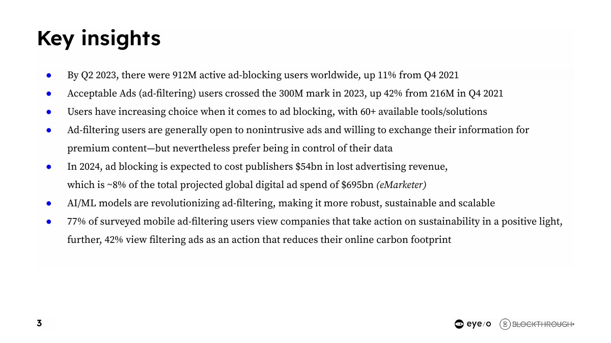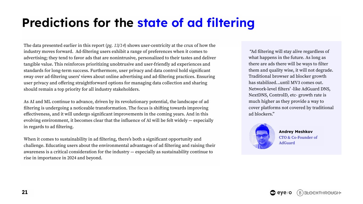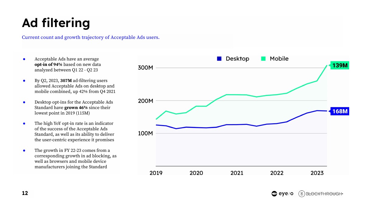 最后,研究还强调了广告过滤的使用,估计有3.07亿广告过滤用户在PC和移动设备上允许可接受的广告,比2021年第四季度增长了42%。可接受广告用户的增长证明了这样一个事实:即用户对非侵入性广告持开放态度,从而支持发布商和创作者的努力。