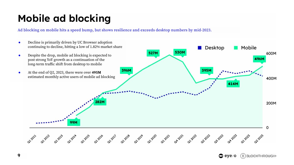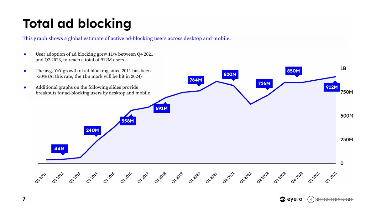 使用广告拦截应用软件的用户在全球范围内持续增长,今年第二季度估计达到9.12亿人。这比2022年第四季度估计的8.5亿人增长了7%,是有史以来的最高水平。