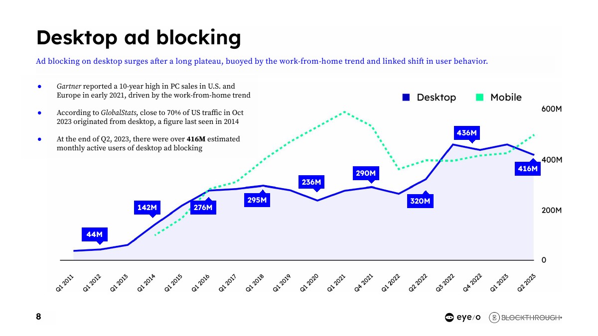 调查显示,移动设备上的广告拦截超过了台式机。截至第二季度末,移动广告拦截工具的月活跃用户估计为4.96亿人,高于2022年第四季度的4.14亿人。最新数据仍低于2020年和2021年创下的高点,当时每月活跃用户超过5.25亿人,在2022年初降至4亿人以下。