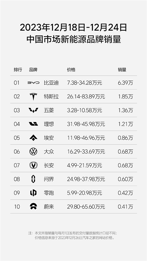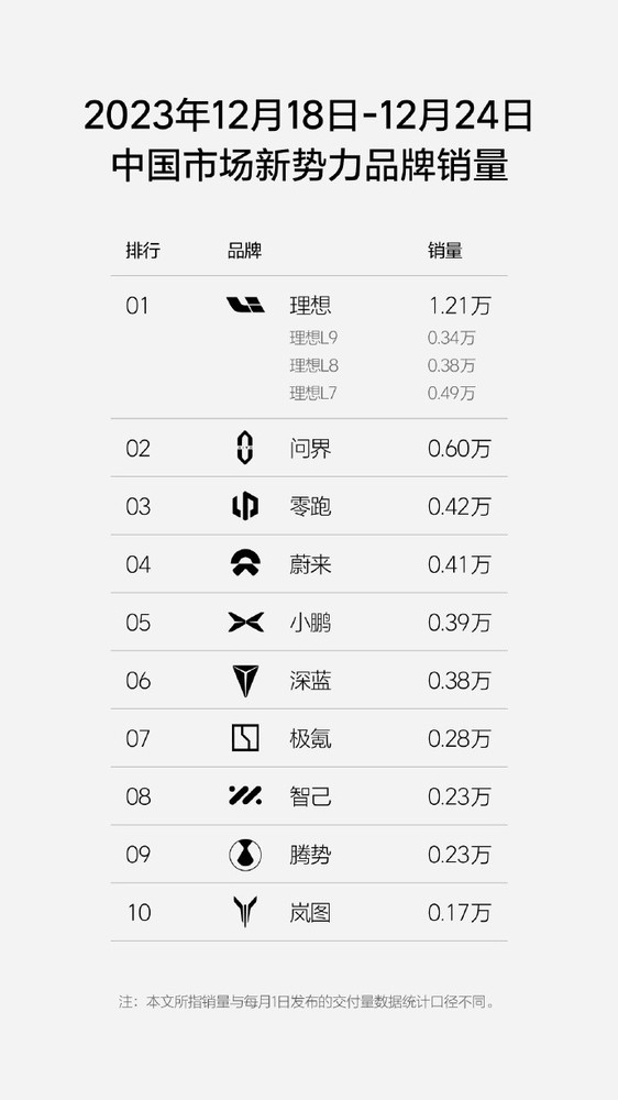 2023 年第 52 周(12.18-12.24),理想汽车周销量达 1.21 万辆;截至 12 月 24 日,理想汽车本月销量已达 3.64 万辆,领跑新势力。