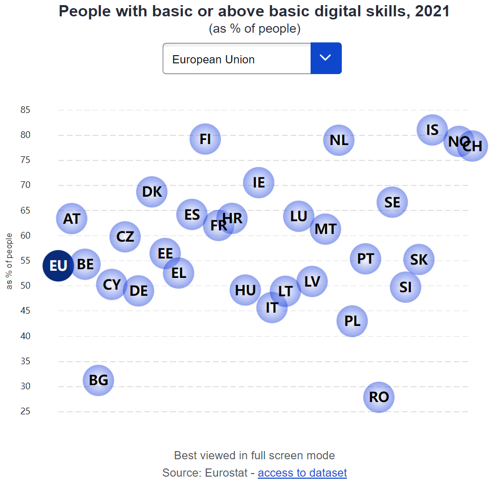 虽然近90%的欧盟人口每周至少使用一次互联网,但到2021年,只有54%的人拥有基本或以上的数字技能。