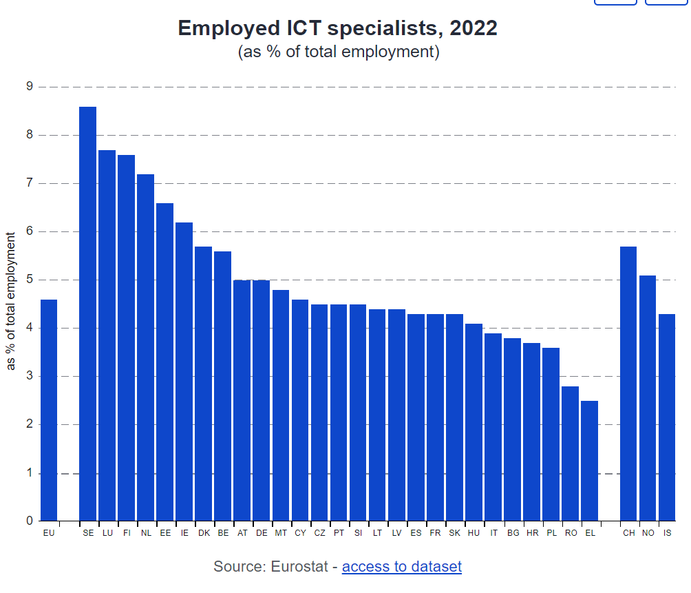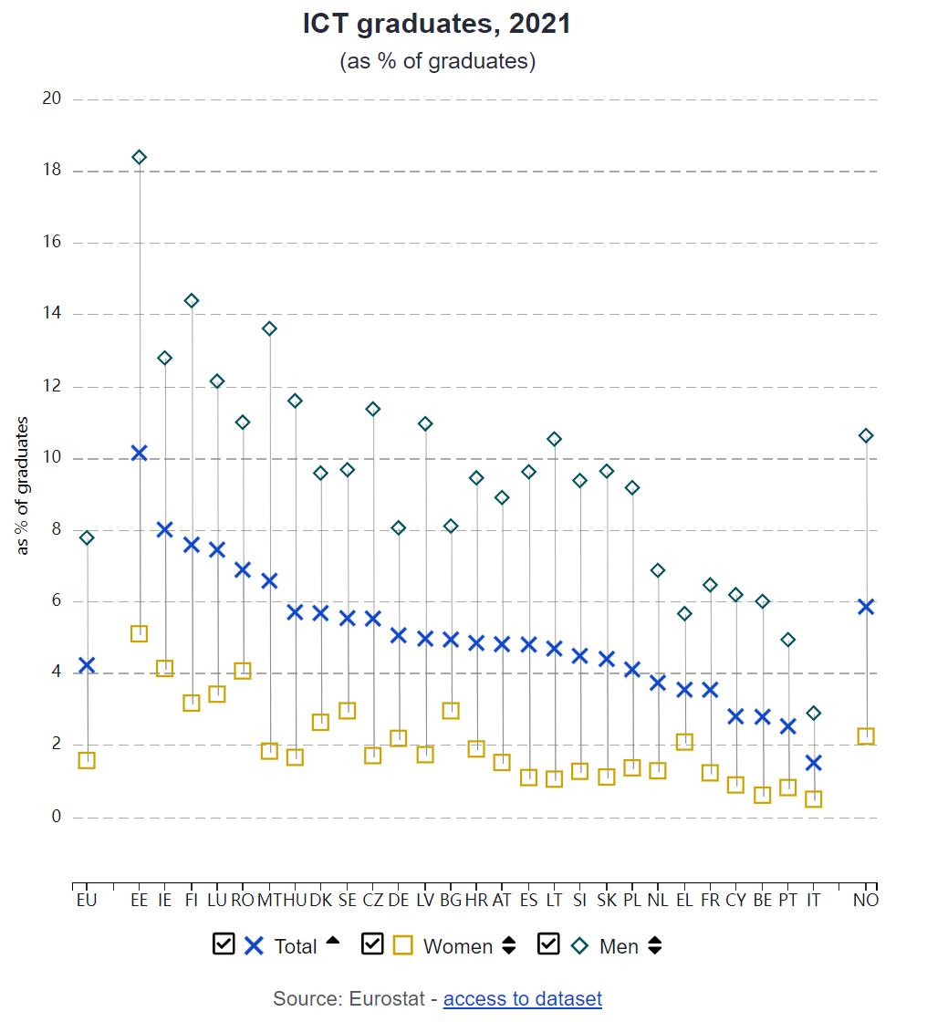 随着业务运作的发展,对信息通信技术专业人员的需求也在增加。2021年,欧盟约有18万名学生毕业于信息通信技术专业,占所有毕业生的4%。ICT专业的毕业生比例在爱沙尼亚(10%)和爱尔兰(8%)最高;相比之下,意大利为2%,葡萄牙、比利时和塞浦路斯分别为3%。