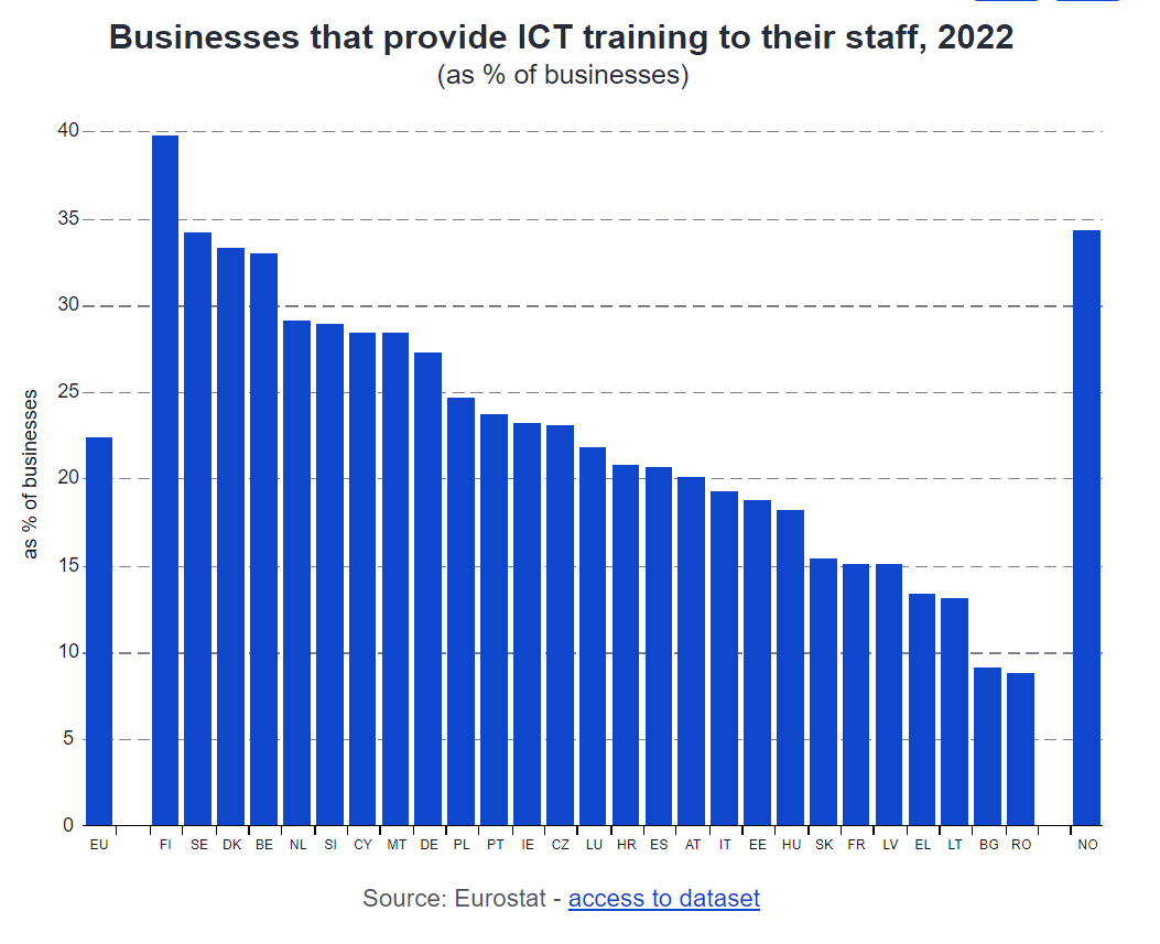 2022年,22%的欧盟企业为员工提供培训,以发展或提高他们的ICT技能。芬兰(40%)、瑞典(34%)、丹麦和比利时(均为33%)是欧盟的领跑者,为员工提供信息通信技术培训的企业比例最高。