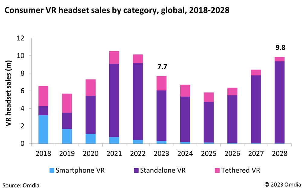 Omdia的一项新研究表明,消费者VR市场出现严重下滑。2023年,头显销量下降了24%,从2022年的1010万部暴跌至770万部。预计2024年和2025年将进一步下降13%,这标志着VR行业在2026年复苏之前将面临一个充满挑战的时期。