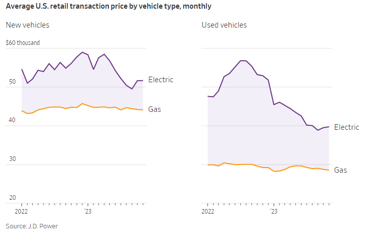 目前,美国汽车制造商正在试图提供更多折扣和低利率优惠,以吸引买家。这些降价措施已推动电动车型新车的价格大幅下跌,而二手车市场上的电动汽车价格跌幅甚至要更大。