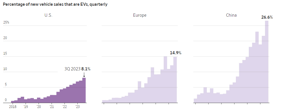 而若放到全球市场进行对比,与全球其他两大汽车市场(中国和欧洲)相比,美国电动汽车的销售起步较慢。研究公司GlobalData的初步数据显示,第三季度在中国售出的汽车中,近27%为电动车型;而在美国,这一比例仅约为8%。在欧洲,第三季度售出的汽车中有近15%是电动汽车。