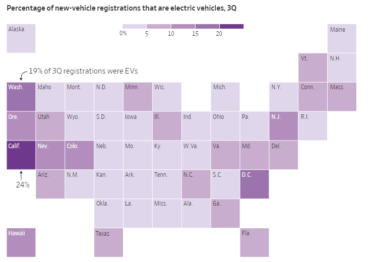 美国汽车制造商面临的另一处关键挑战在于,电动车型的需求并没有在全美均匀分布。根据标准普尔全球移动数据,美国电动汽车销售主要集中在少数几个州。