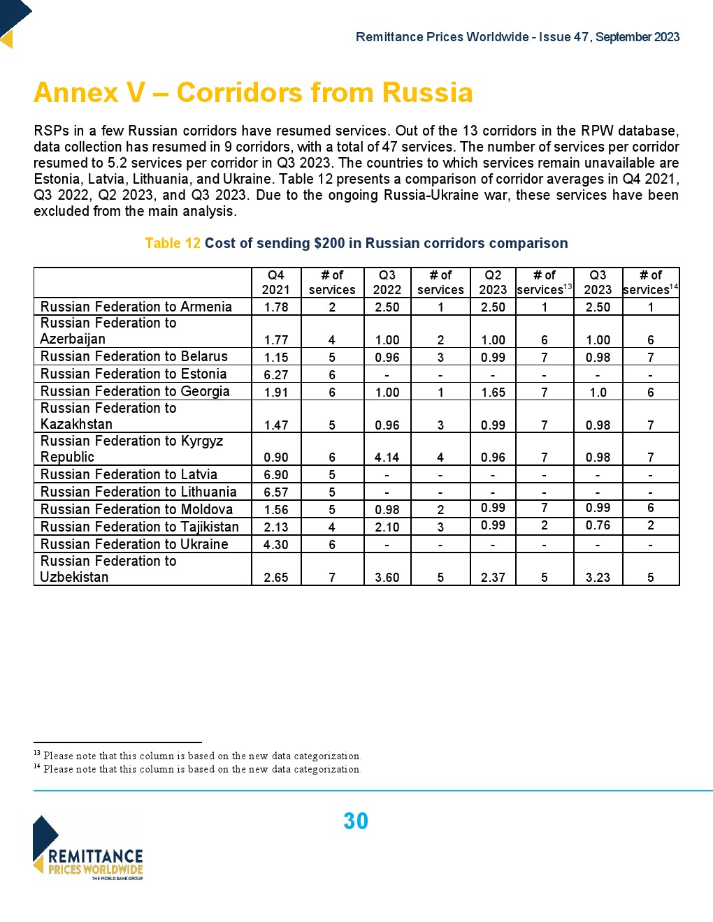 由于持续的俄乌战事,2022年第一和第二季度RPW不包括俄罗斯的任何数据。2022年Q3-Q4和2023年Q1-Q3期间,仅收集了来自俄罗斯的公开在线数据。由于数据收集方法的这种偏差,这些服务未包括在2023年第三季度的主要分析中。