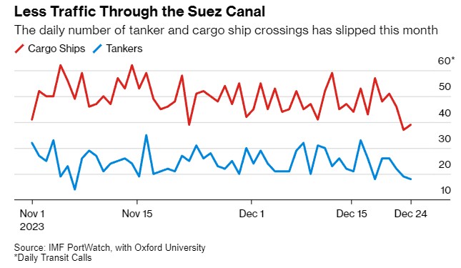 根据 Clarksons 的数据,苏伊士运河的过境情况也类似,12 月 22 日至 26 日期间,向南航行的船只减少了约 45%。