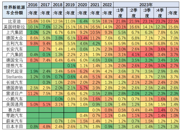从历年销量份额看,中国的比亚迪世界领先,2023年第四季度,比亚迪新能源汽车占全球份额的23.2%,这意味着,全球每卖出4辆新能源汽车 就有1辆比亚迪。