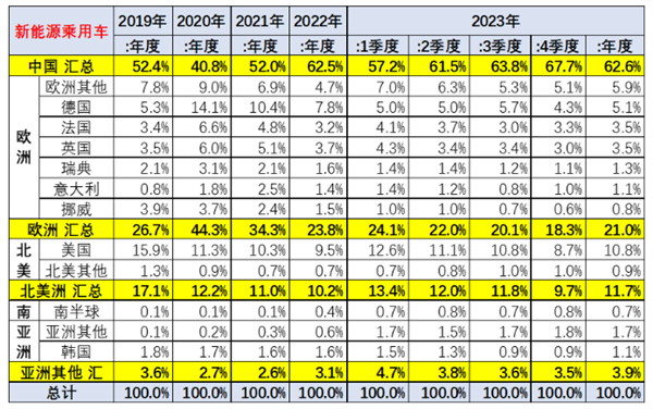 近几年中国新能源乘用车的增速强于世界平均增长速度,2020年中国新能源乘用车世界份额40.8%,2021年蹿至52%,2022年达到62.5%。2023年1-11月的中国占世界份额62.6%,4季度份额67.7%。