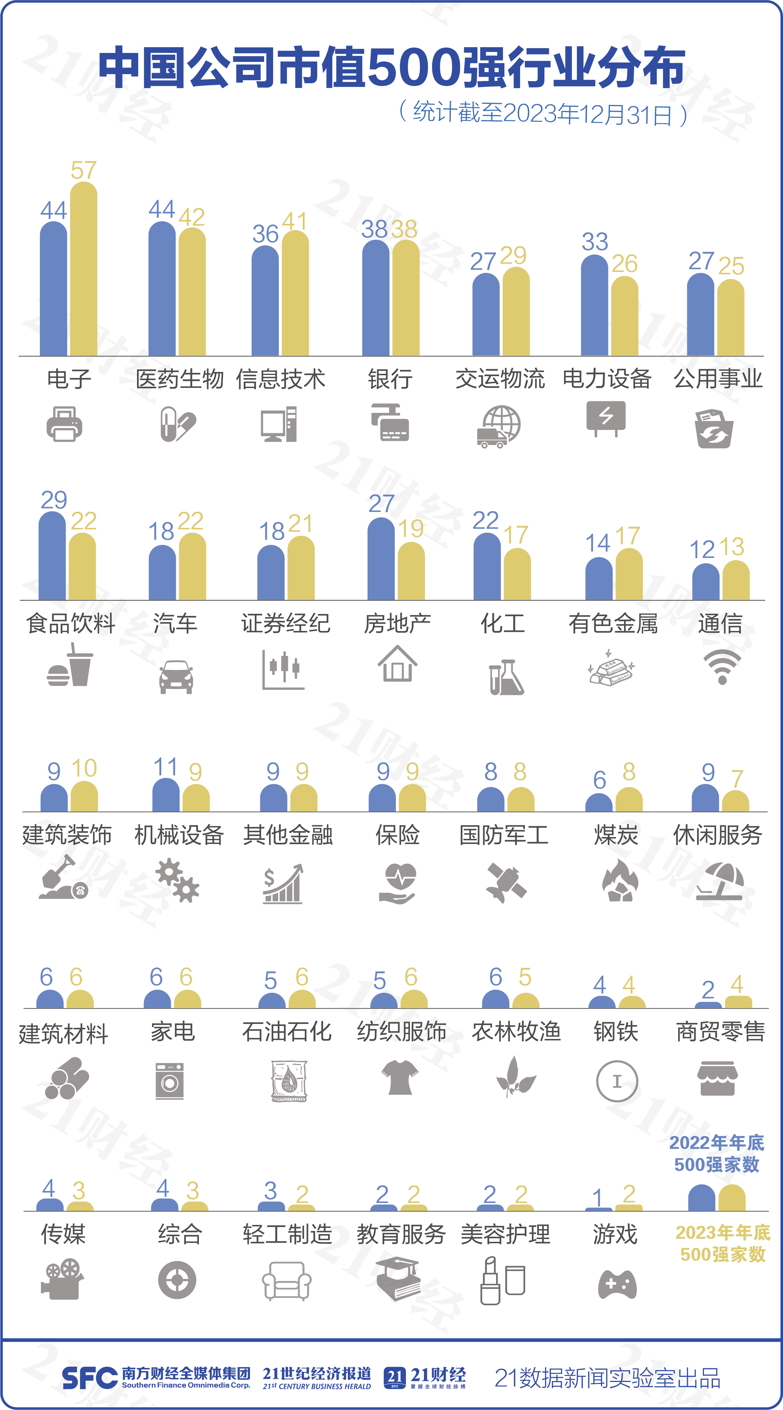 整体来看,中国500强公司依然集中在大金融(77家)、电子(57家)、医药生物(42家)、信息技术(41家)等。