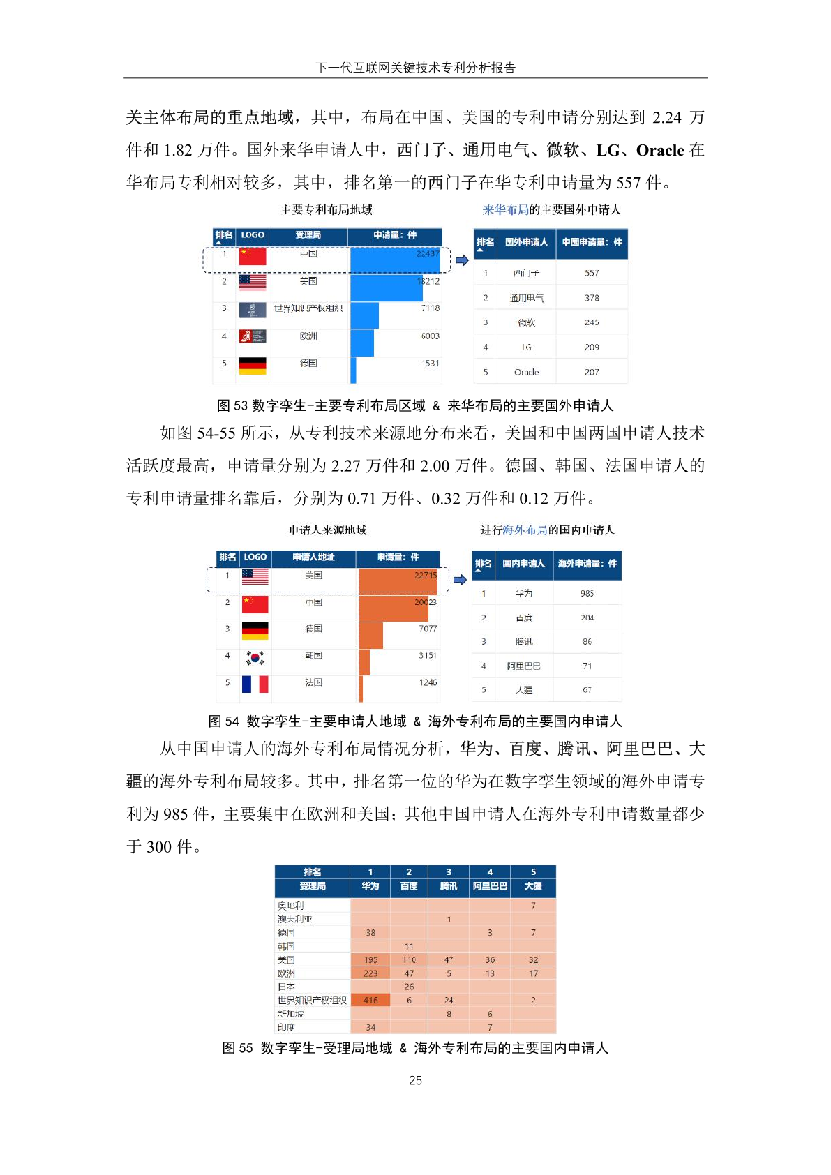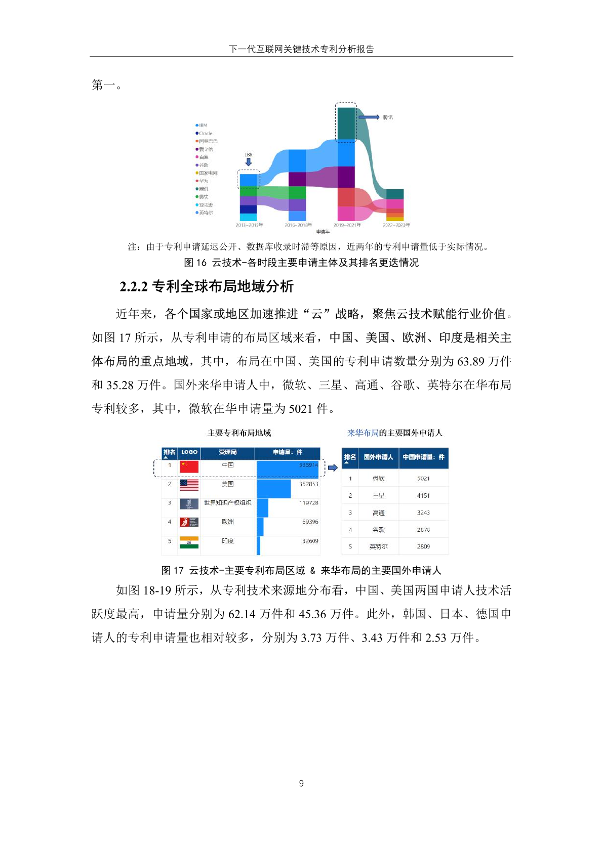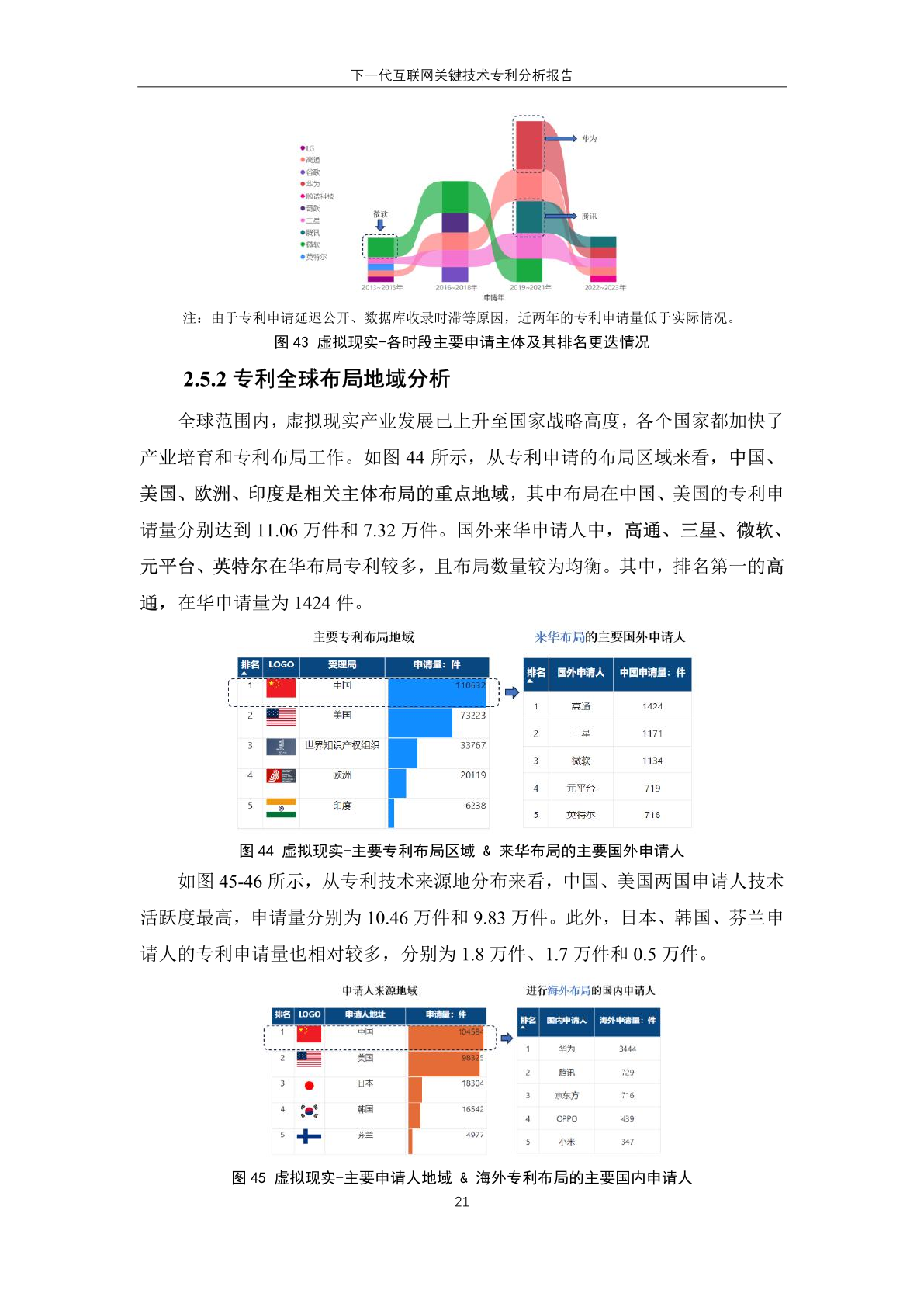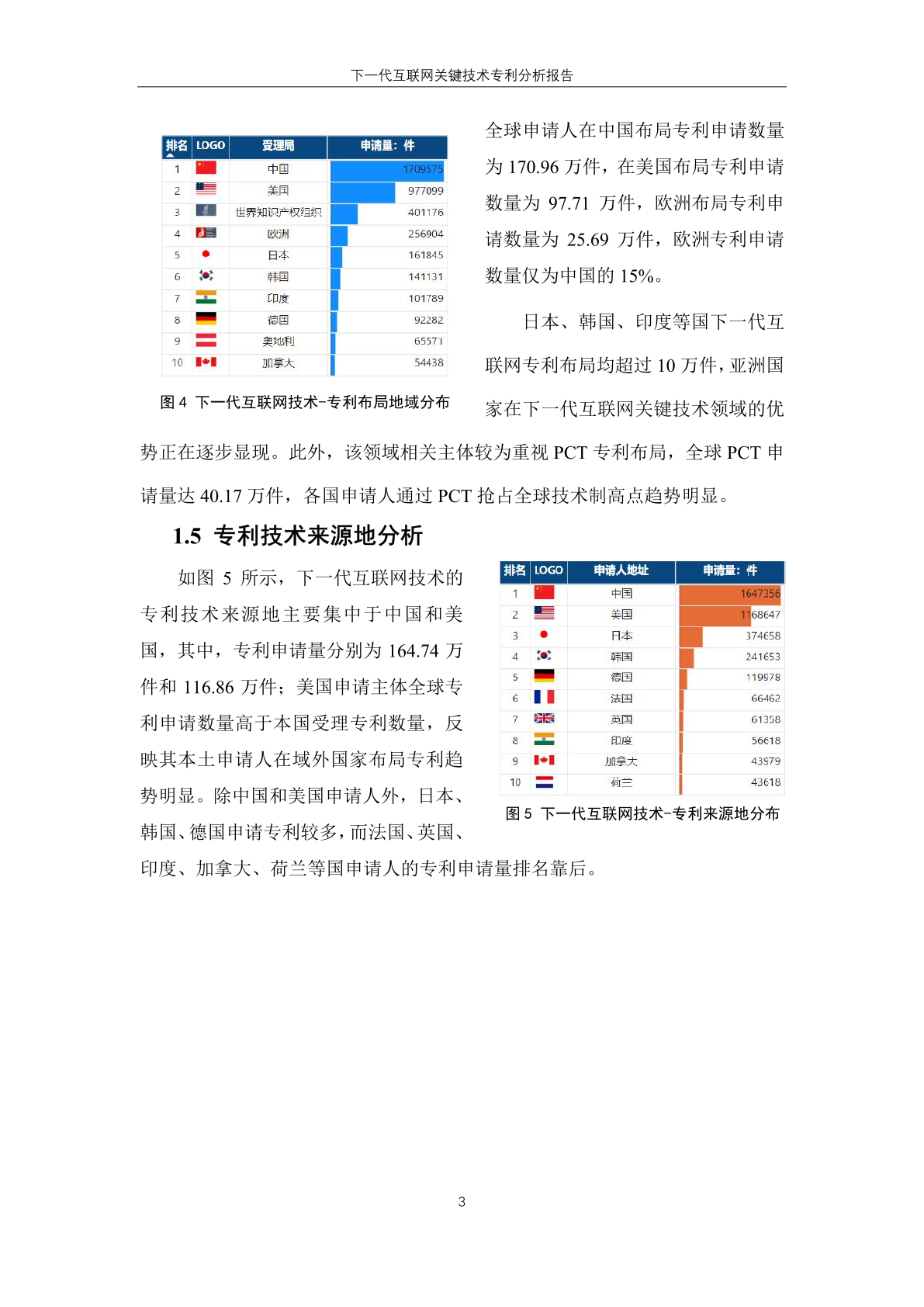 下一代互联网技术的 专 利 技 术 来 源 地 主要集中于中国和 美 国,其中,专利申请量分别为 164.74 万 件和 116.86 万件;美国申请主体全球专 利申请数量高于本国受理专利数量,反 映其本土申请人在域外国家布局专利趋 势明显。