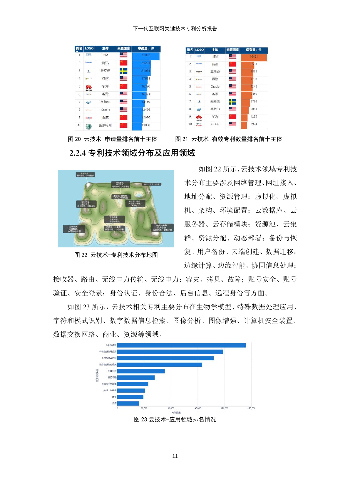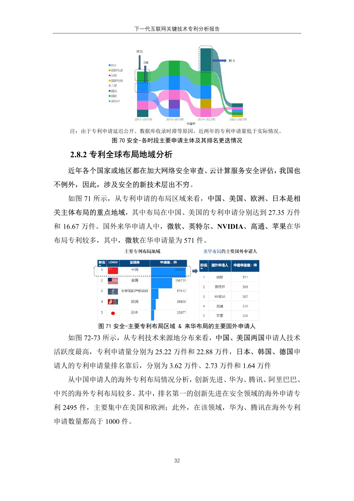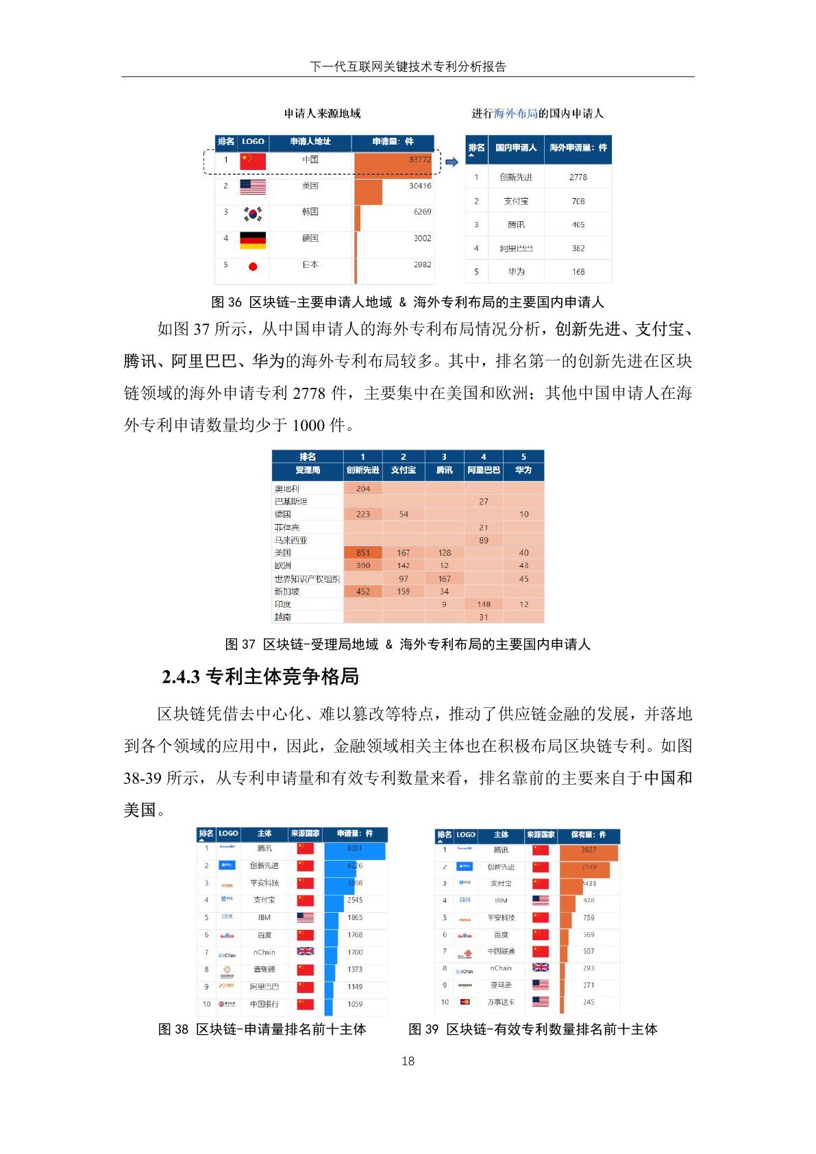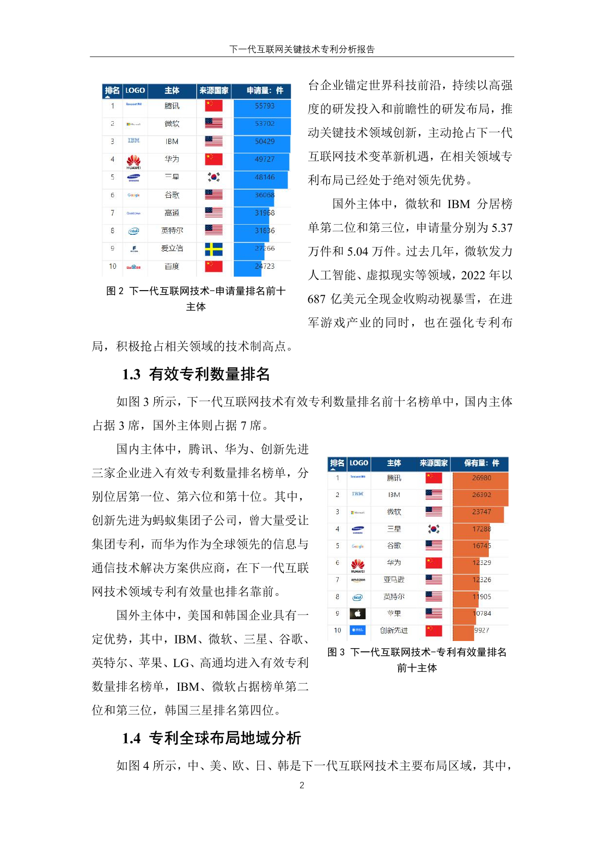 国内主体中,腾讯、华为、创新先进三家企业进入有效专利数量排名榜单,分 别位居第一位、第六位和第十位。其中, 创新先进为蚂蚁集团子公司,曾大量受让 集团专利,而 华为作为全球领先的信息与 通信技术解决方案供应商,在下一代互联 网技术领域专利有效量也排名靠前。