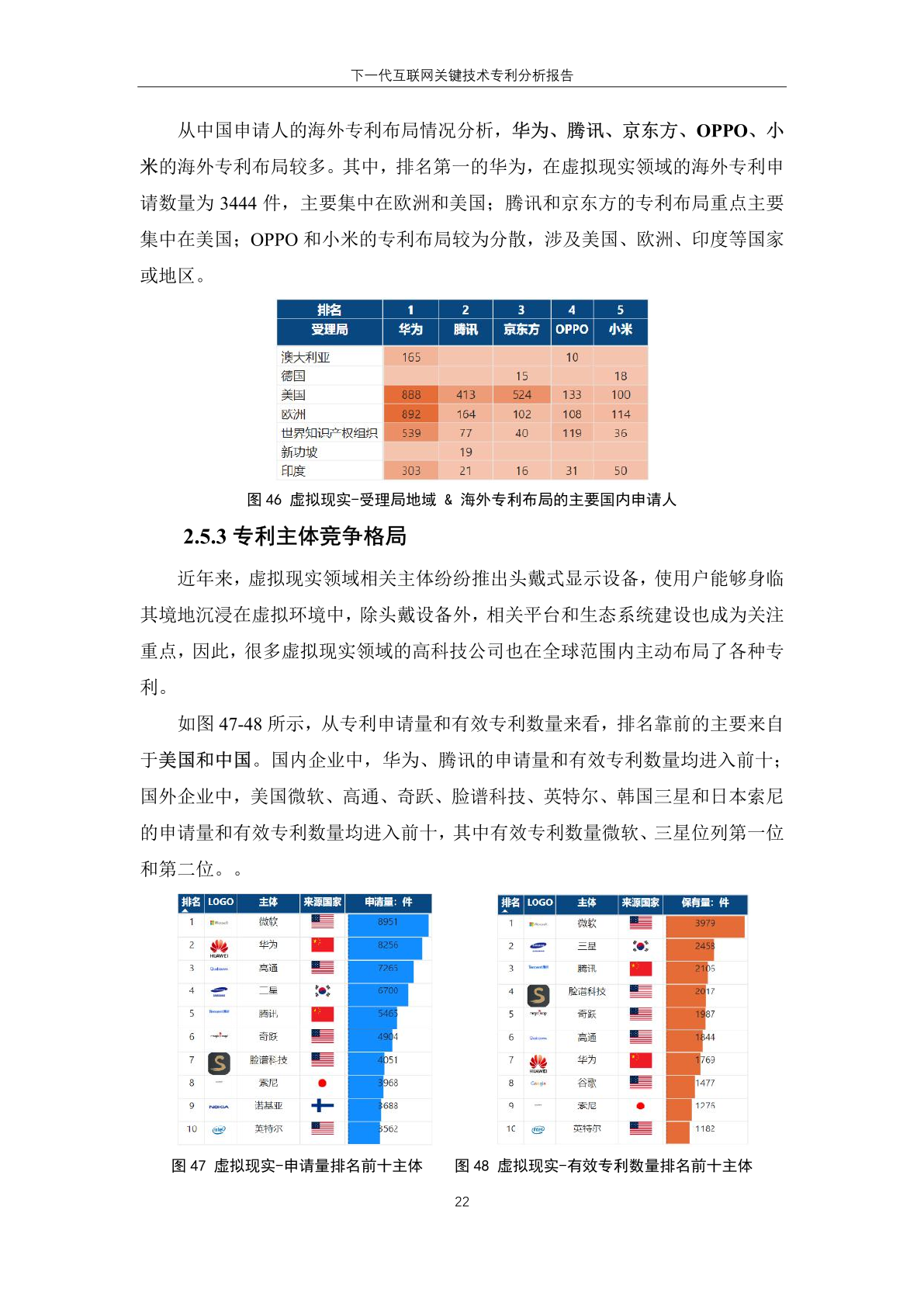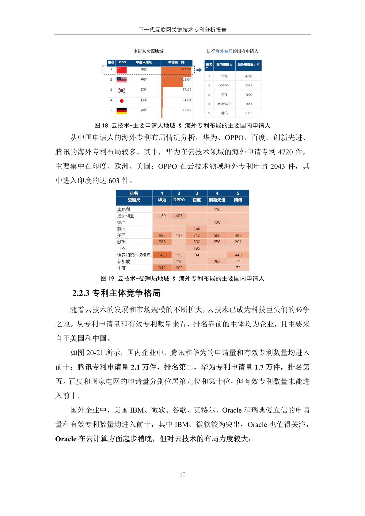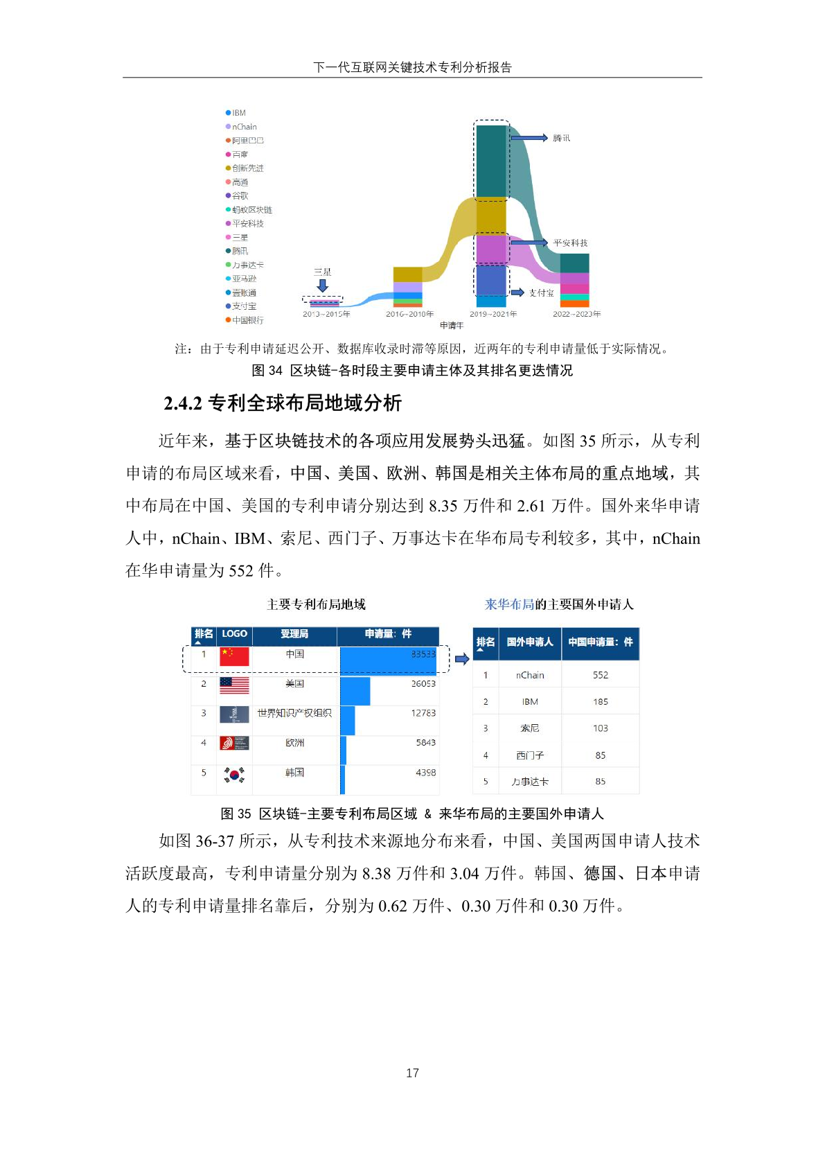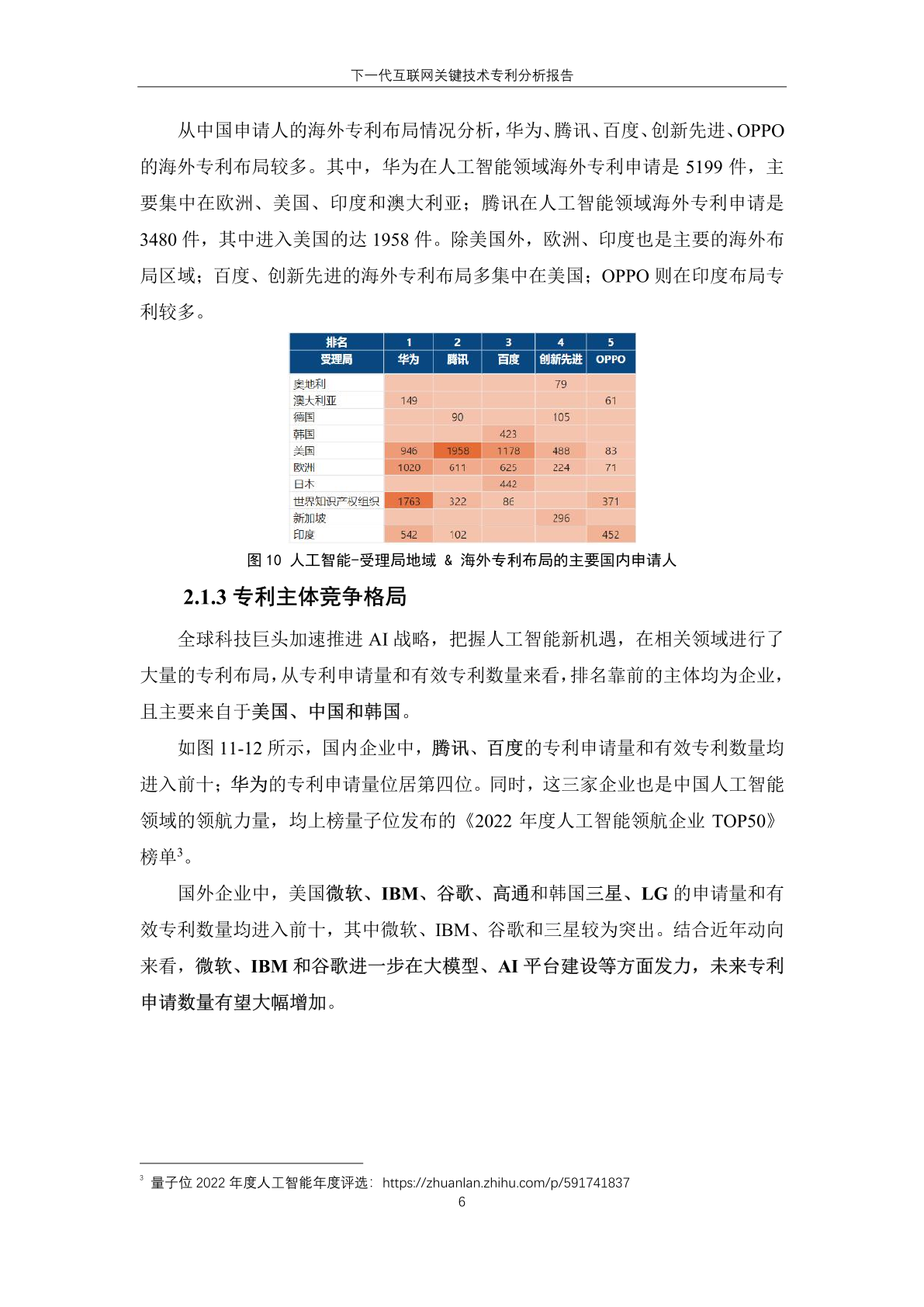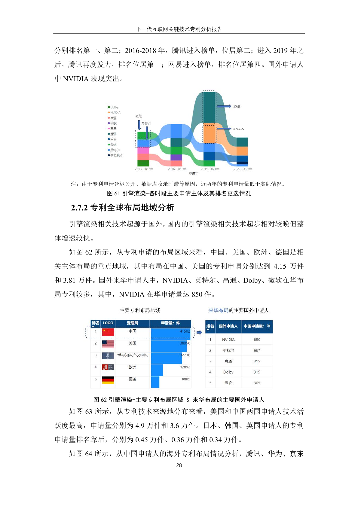 国内主体中,腾讯、华为、创新先进三家企业进入有效专利数量排名榜单,分 别位居第一位、第六位和第十位。其中, 创新先进为蚂蚁集团子公司,曾大量受让 集团专利,而 华为作为全球领先的信息与 通信技术解决方案供应商,在下一代互联 网技术领域专利有效量也排名靠前。