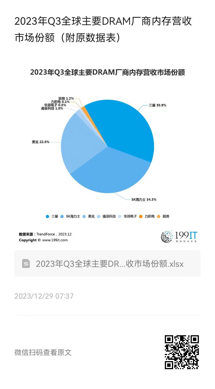 2023年Q3全球主要DRAM厂商内存营收市场份额(附原数据表) ​​​