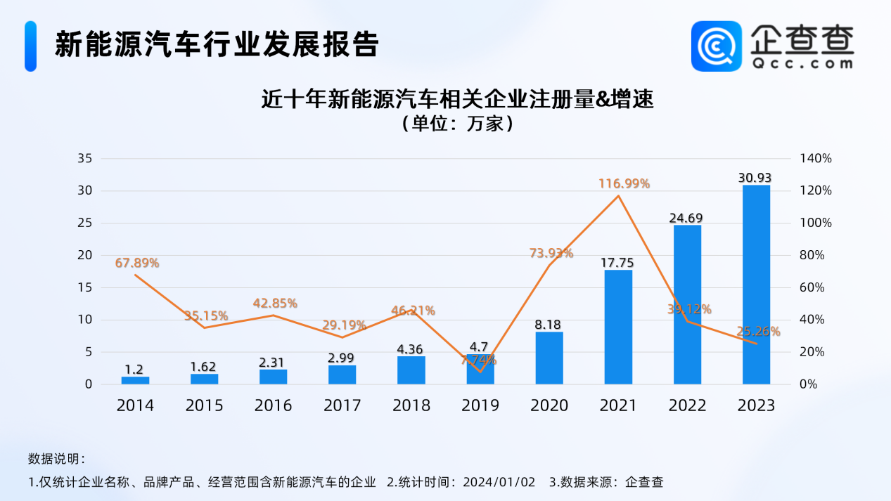 今年我国新能源汽车相关企业注册量首突破30万大关,同比增长25.26%。