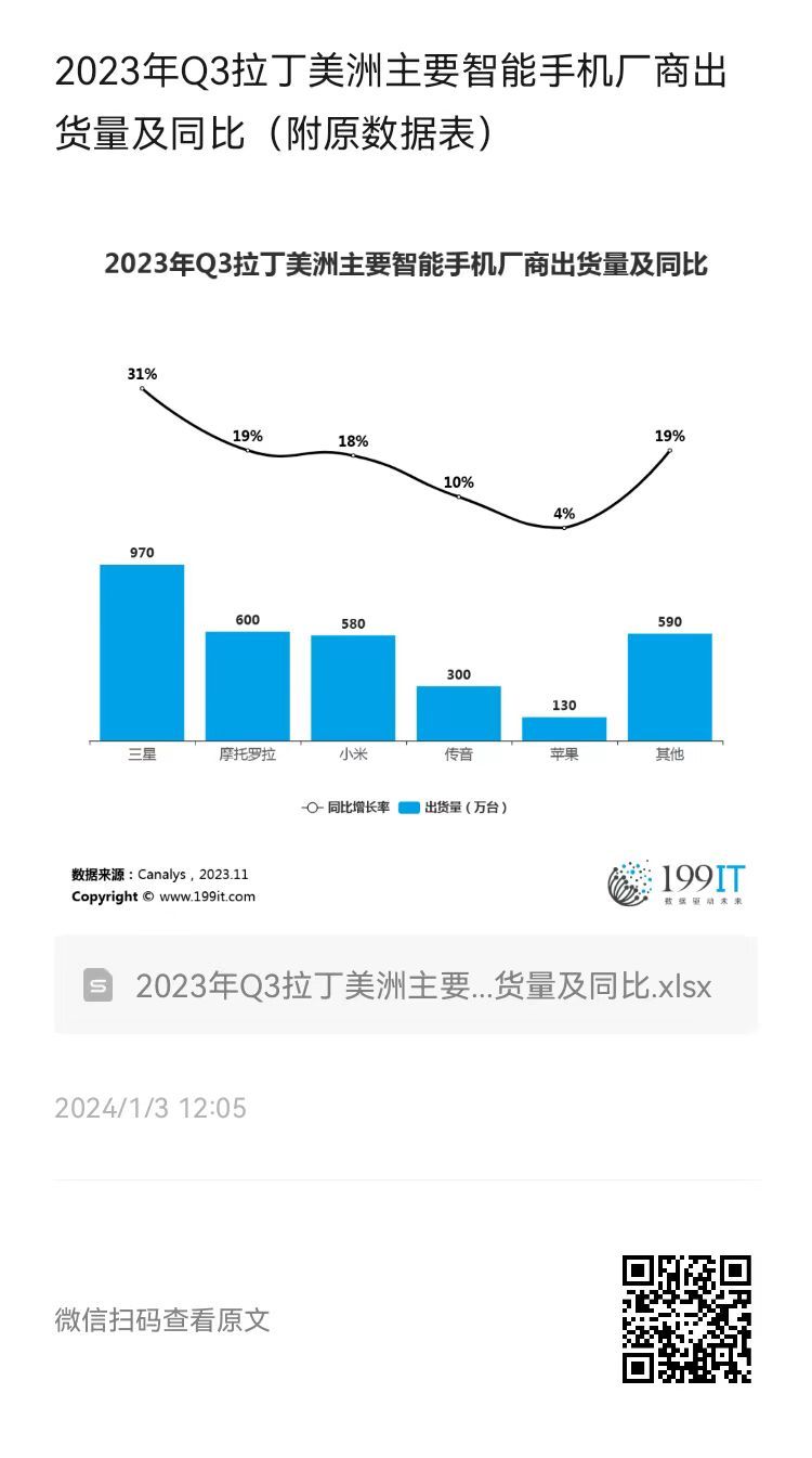 2023年Q3拉丁美洲主要智能手机厂商出货量及同比(附原数据表) ​​​