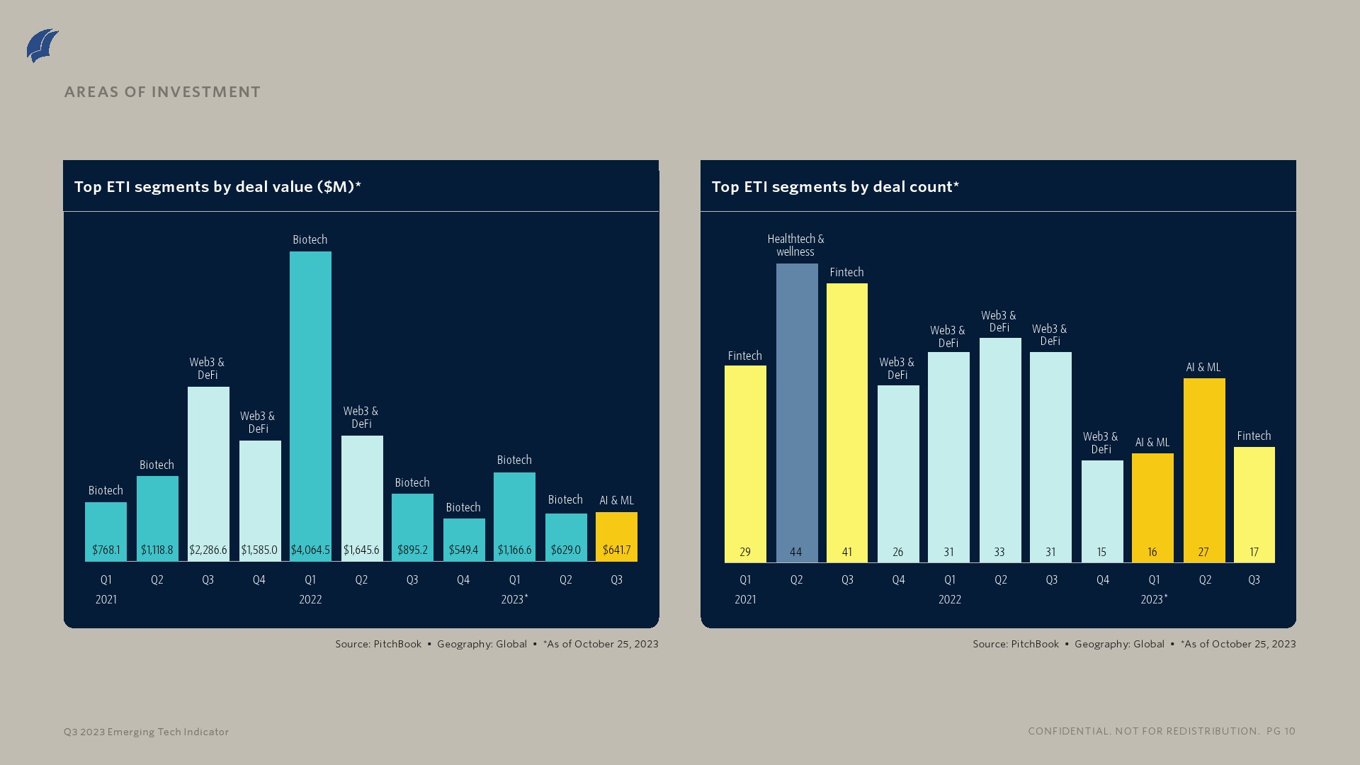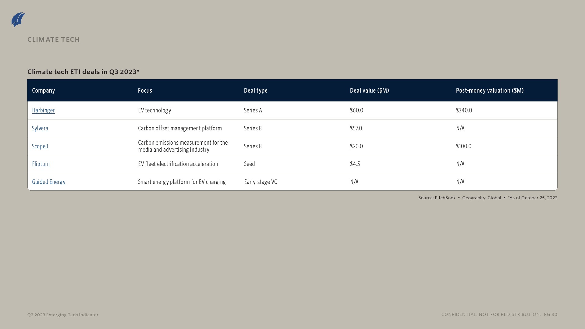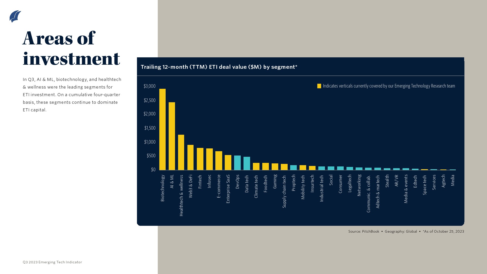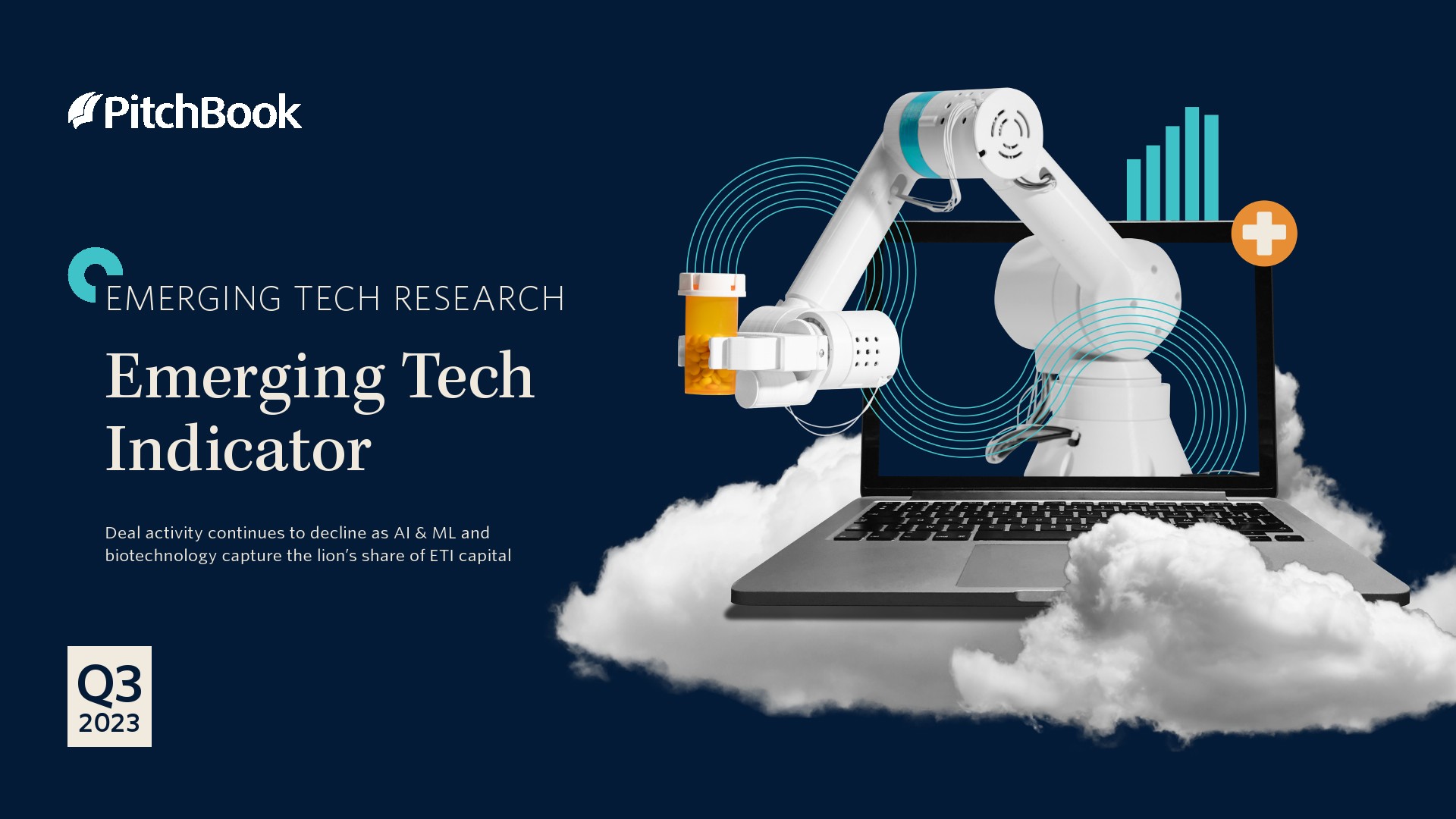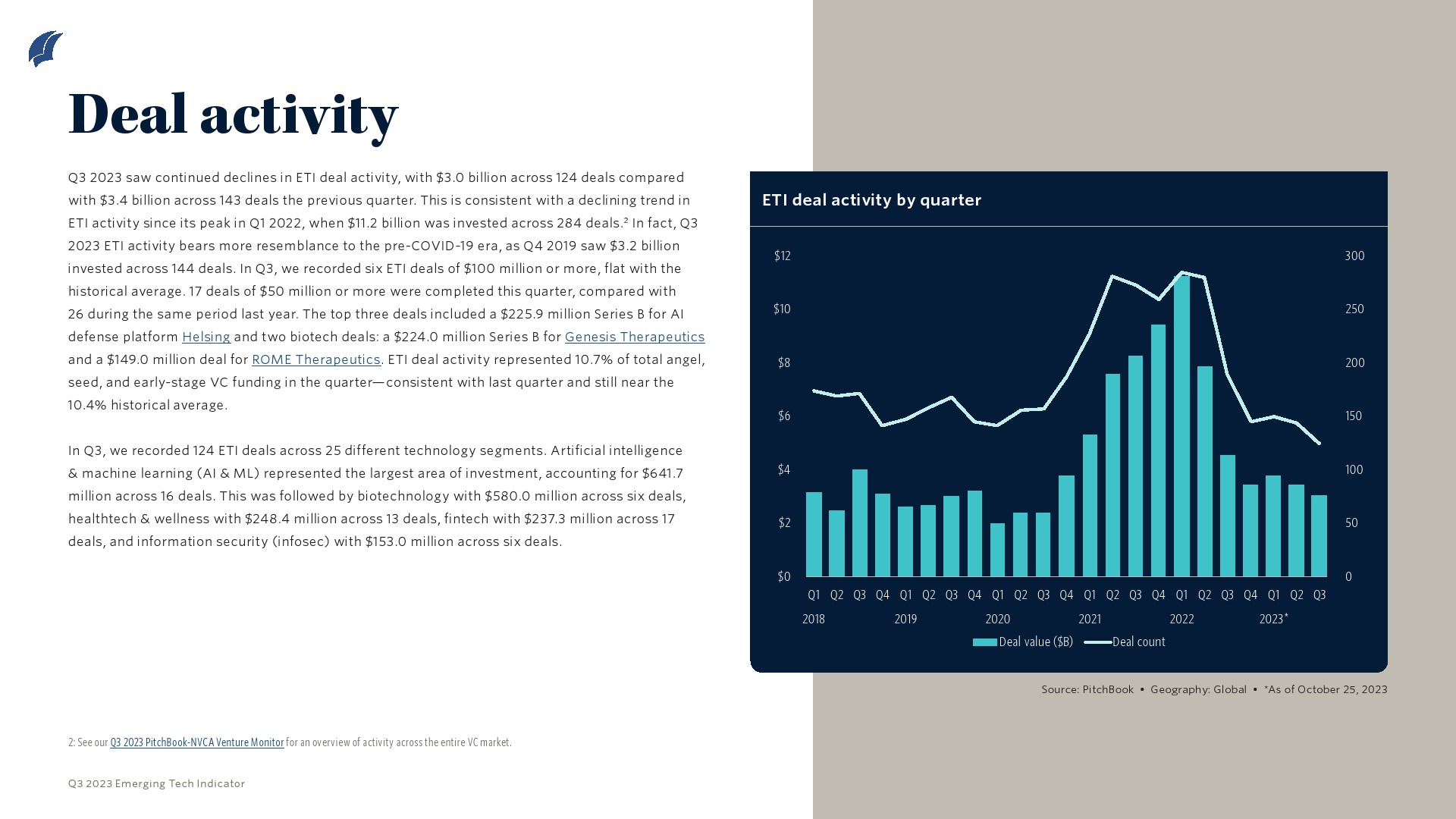 交易活动继续下降:自2022年初以来的广泛下降,2023年第三季度,新兴科技交易活动从上一季度的143笔交易(投资额34亿美元)下降到124笔(30亿美元)。与2022年第一季度的峰值相比,交易数量下降了73.2%,投资额下降了56.3%。新兴科技交易占本季度所有天使、种子和早期风险投资的10.7%,与上一季度保持一致,也与历史平均水平(10.4%)保持一致。