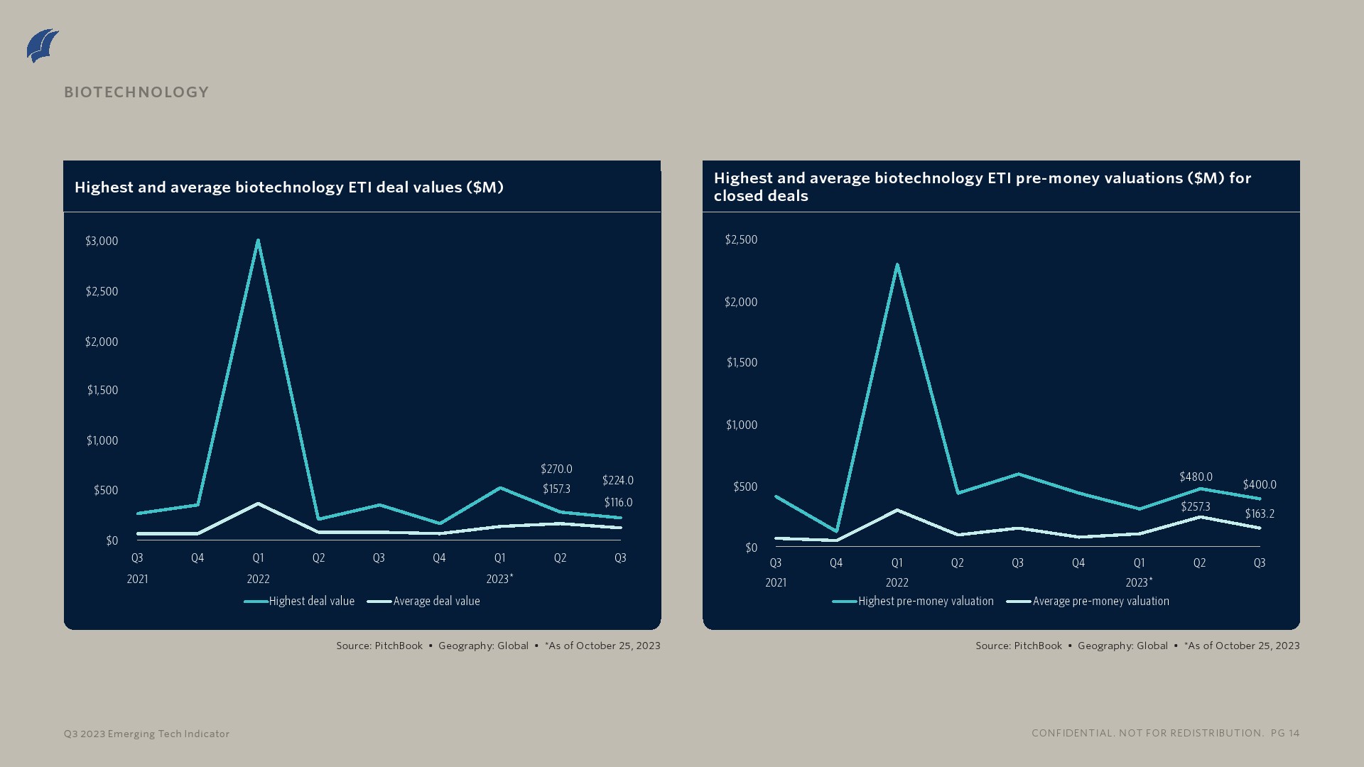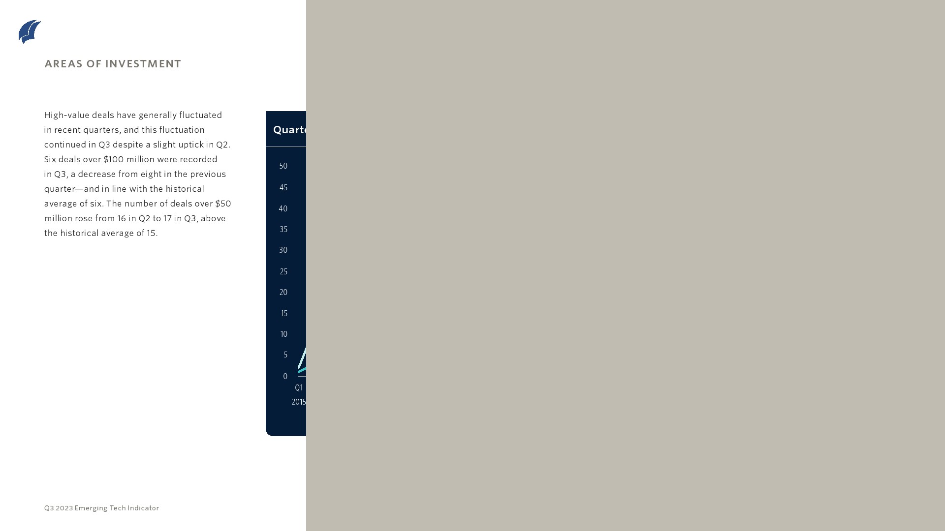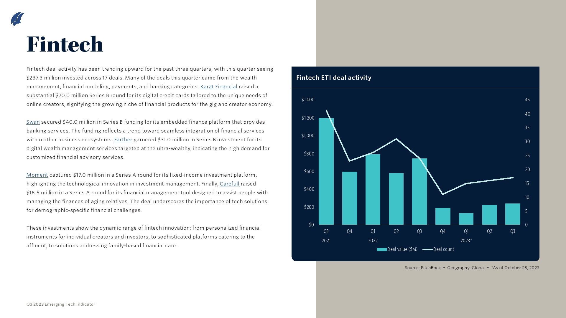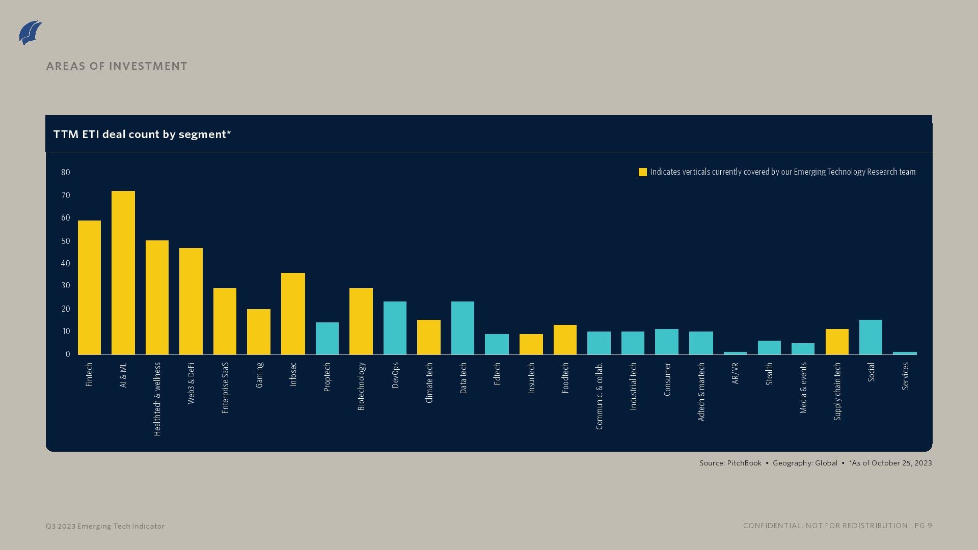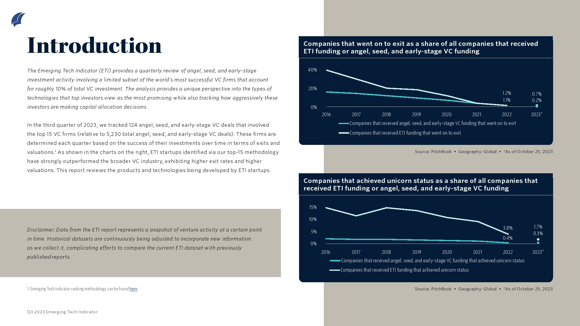 交易活动继续下降:自2022年初以来的广泛下降,2023年第三季度,新兴科技交易活动从上一季度的143笔交易(投资额34亿美元)下降到124笔(30亿美元)。与2022年第一季度的峰值相比,交易数量下降了73.2%,投资额下降了56.3%。新兴科技交易占本季度所有天使、种子和早期风险投资的10.7%,与上一季度保持一致,也与历史平均水平(10.4%)保持一致。