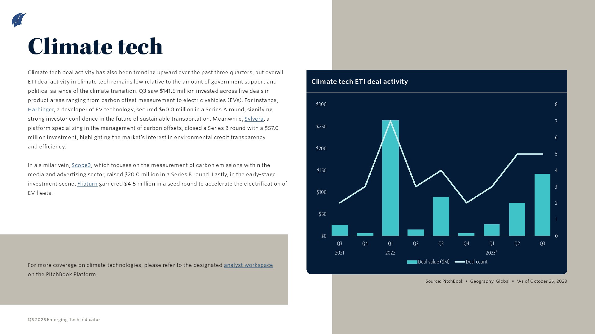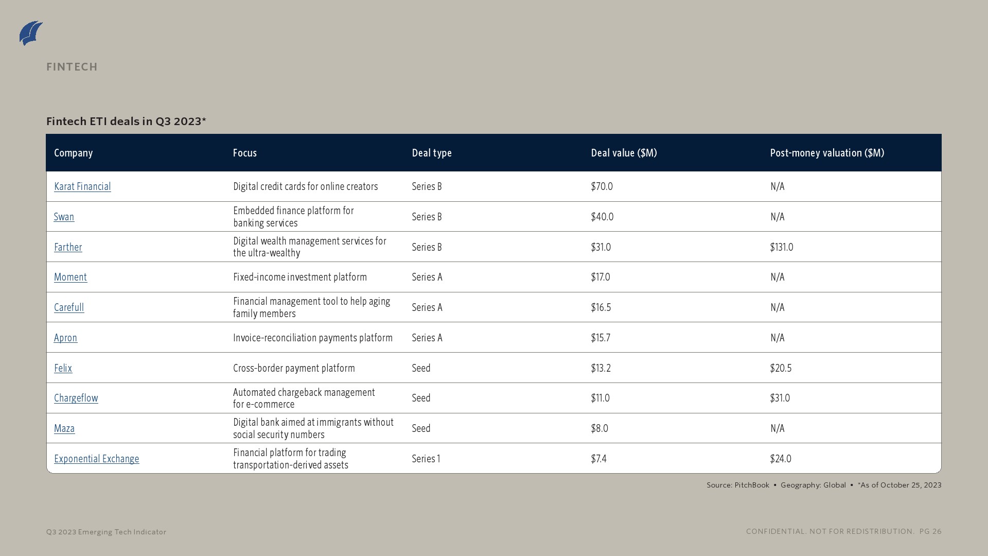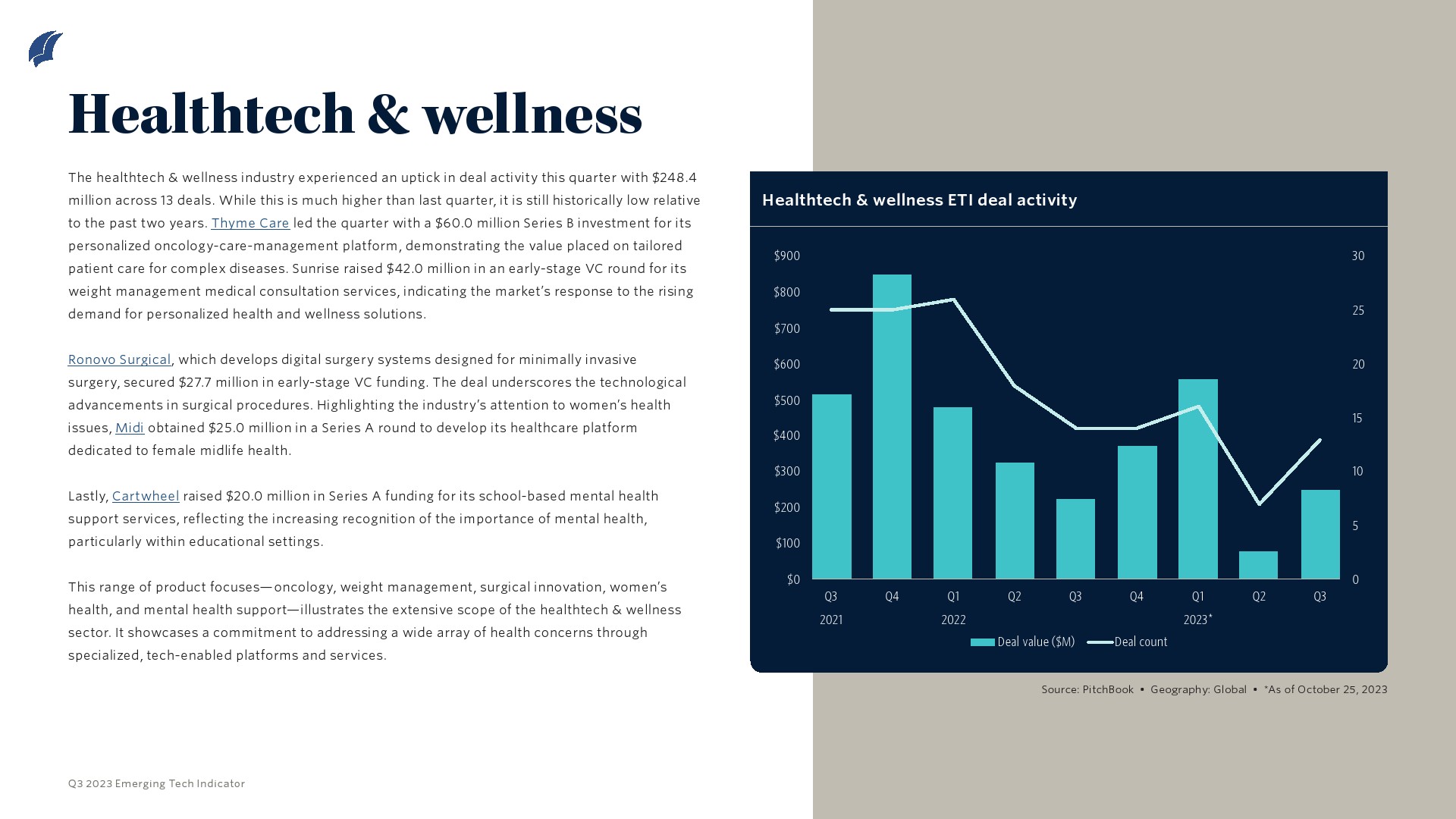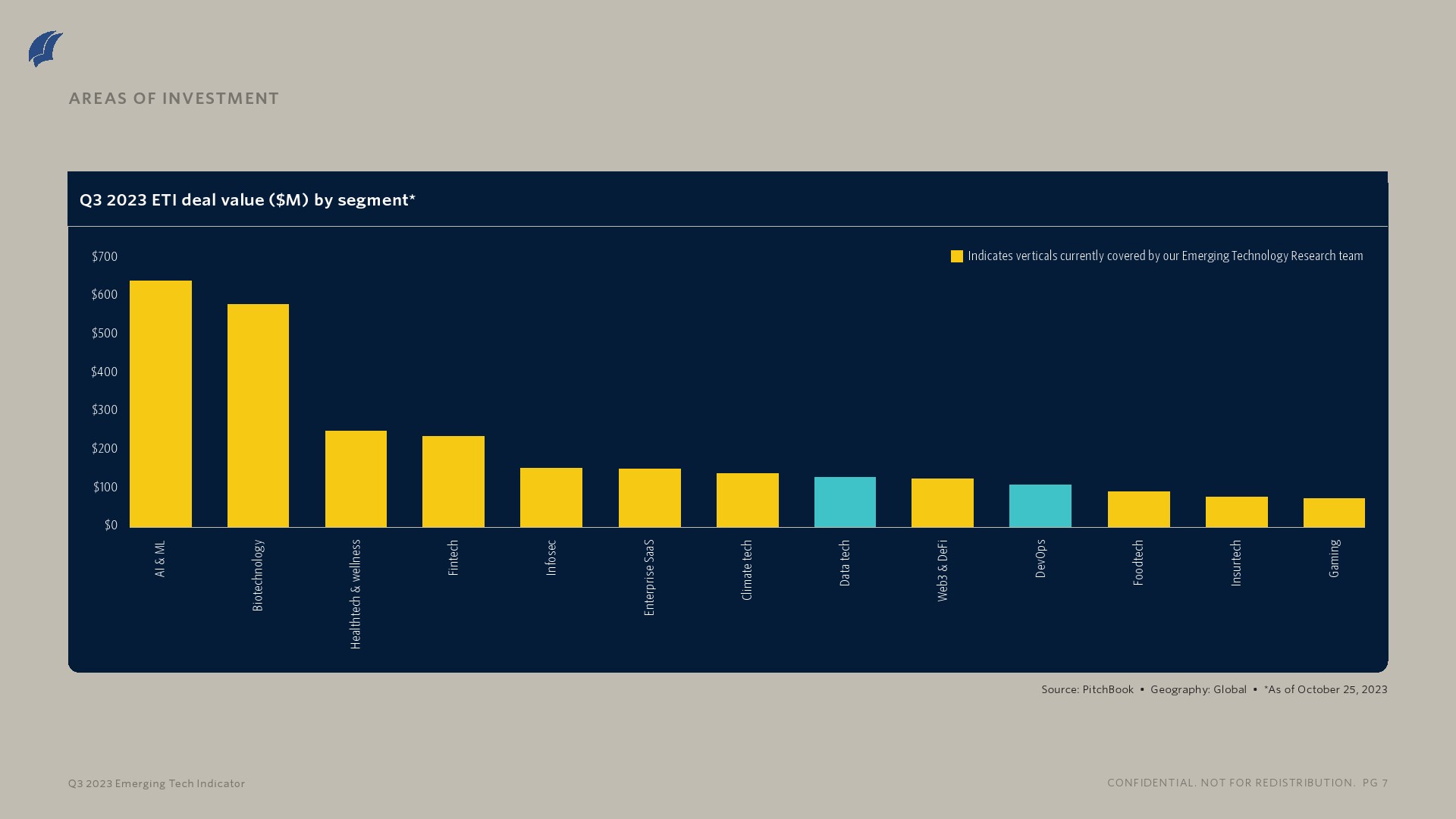 交易活动继续下降:自2022年初以来的广泛下降,2023年第三季度,新兴科技交易活动从上一季度的143笔交易(投资额34亿美元)下降到124笔(30亿美元)。与2022年第一季度的峰值相比,交易数量下降了73.2%,投资额下降了56.3%。新兴科技交易占本季度所有天使、种子和早期风险投资的10.7%,与上一季度保持一致,也与历史平均水平(10.4%)保持一致。