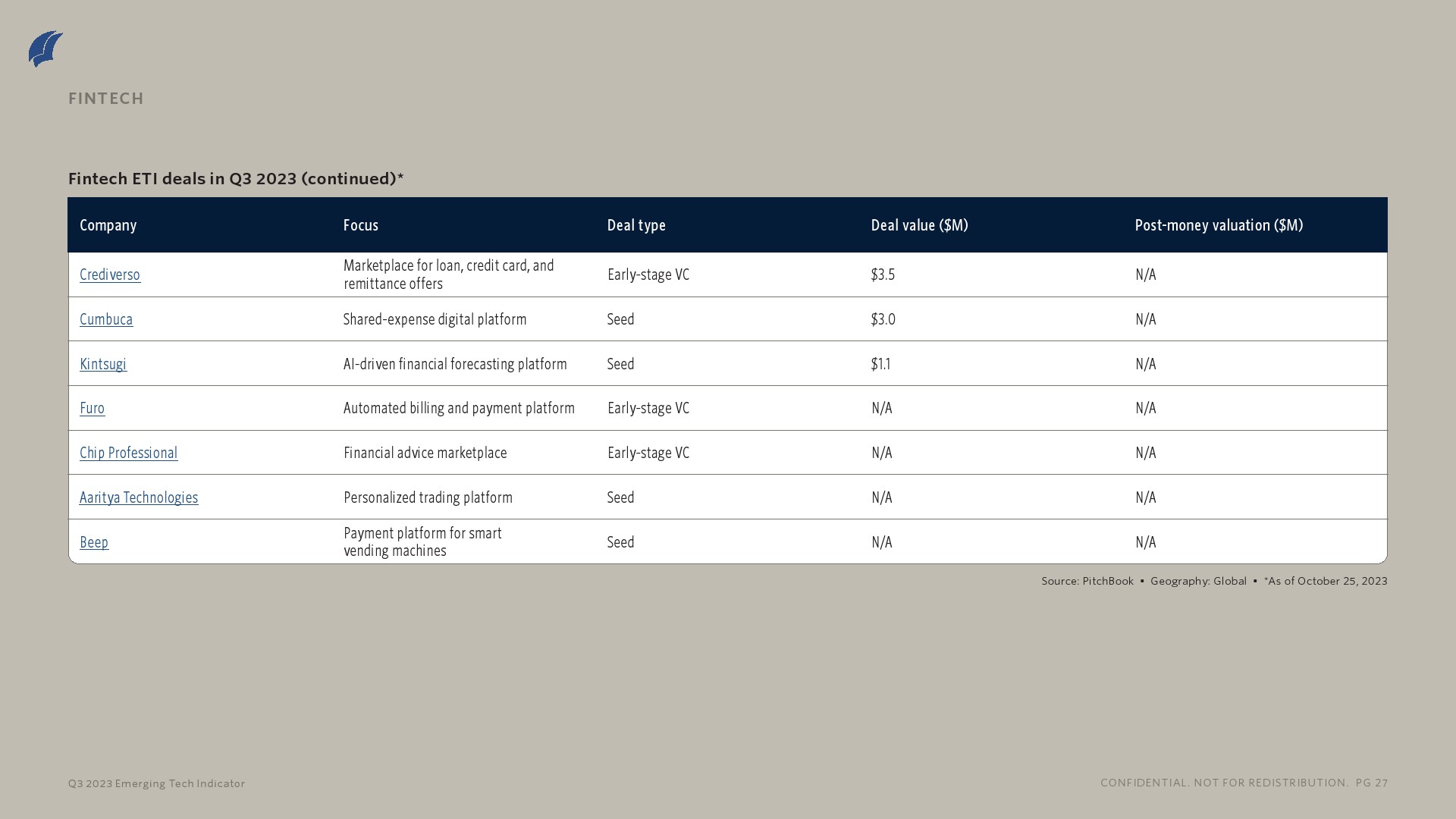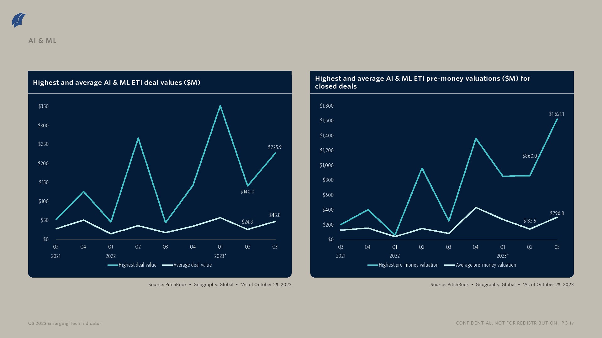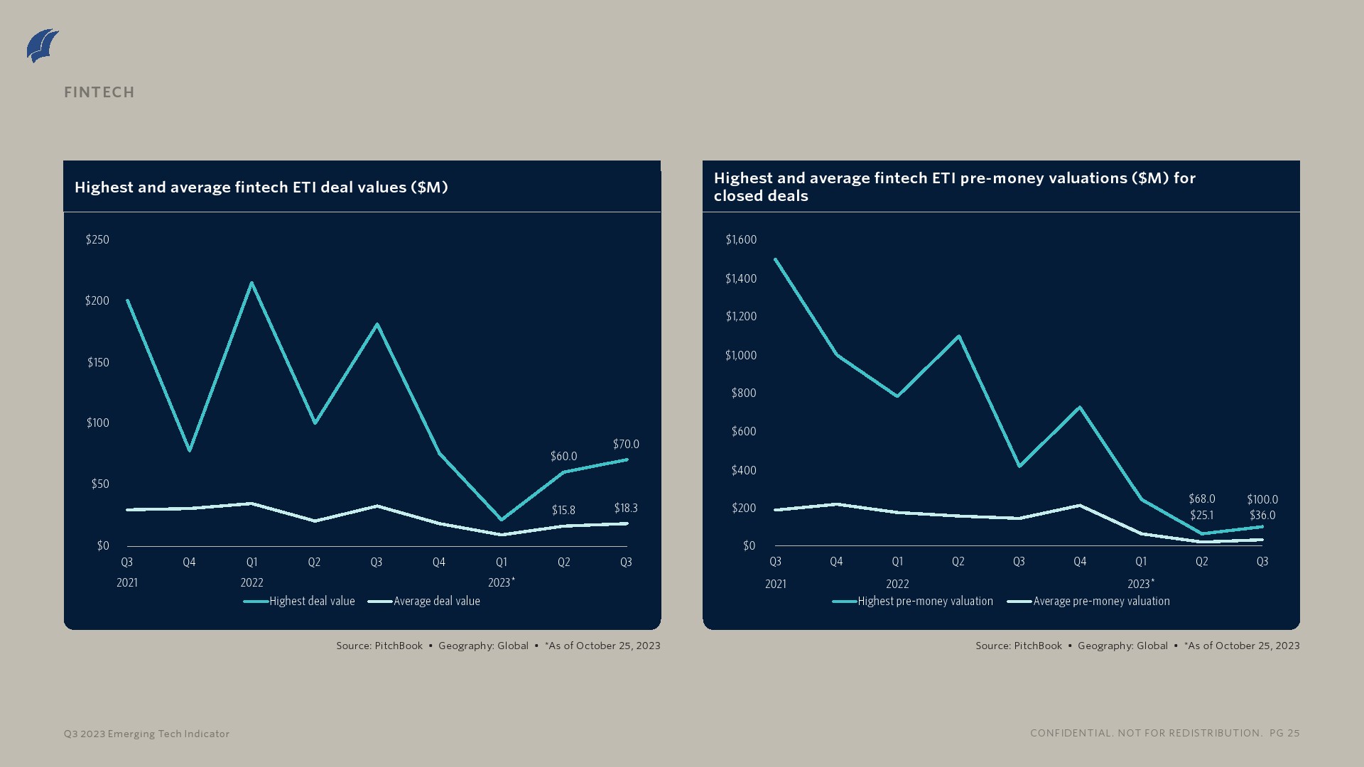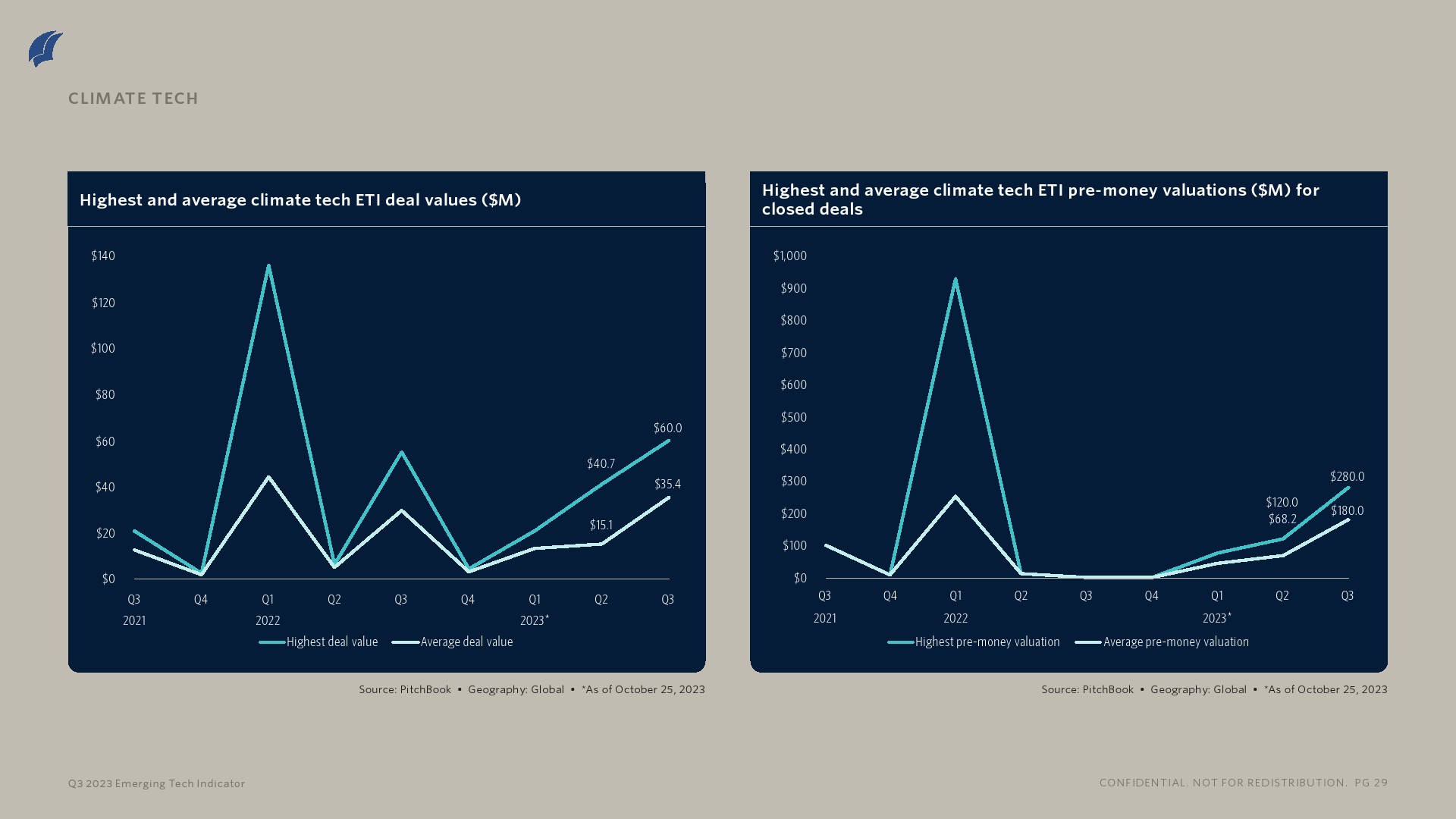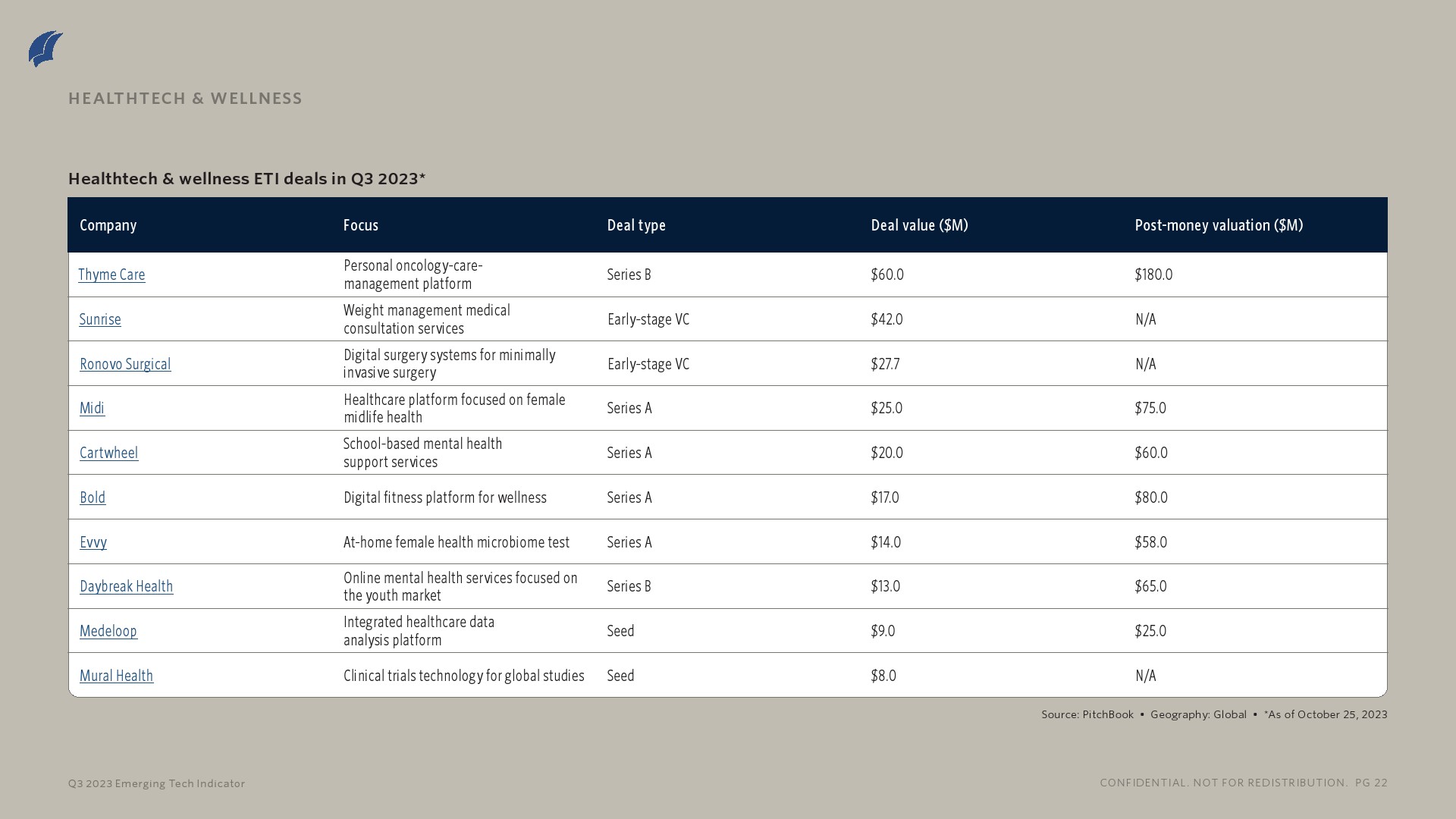 交易活动继续下降:自2022年初以来的广泛下降,2023年第三季度,新兴科技交易活动从上一季度的143笔交易(投资额34亿美元)下降到124笔(30亿美元)。与2022年第一季度的峰值相比,交易数量下降了73.2%,投资额下降了56.3%。新兴科技交易占本季度所有天使、种子和早期风险投资的10.7%,与上一季度保持一致,也与历史平均水平(10.4%)保持一致。