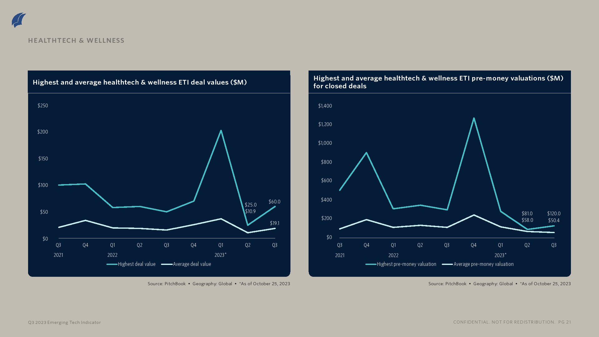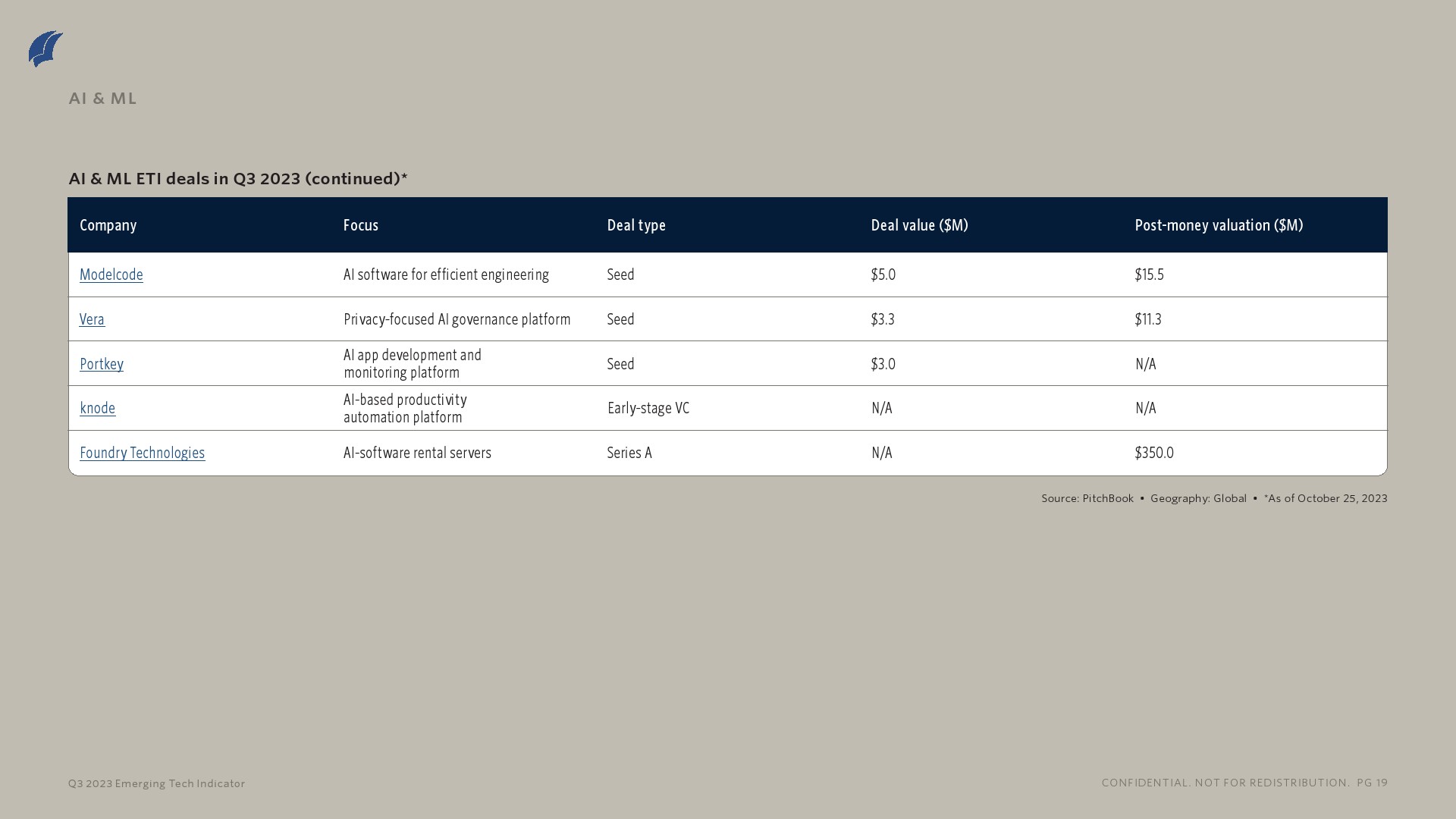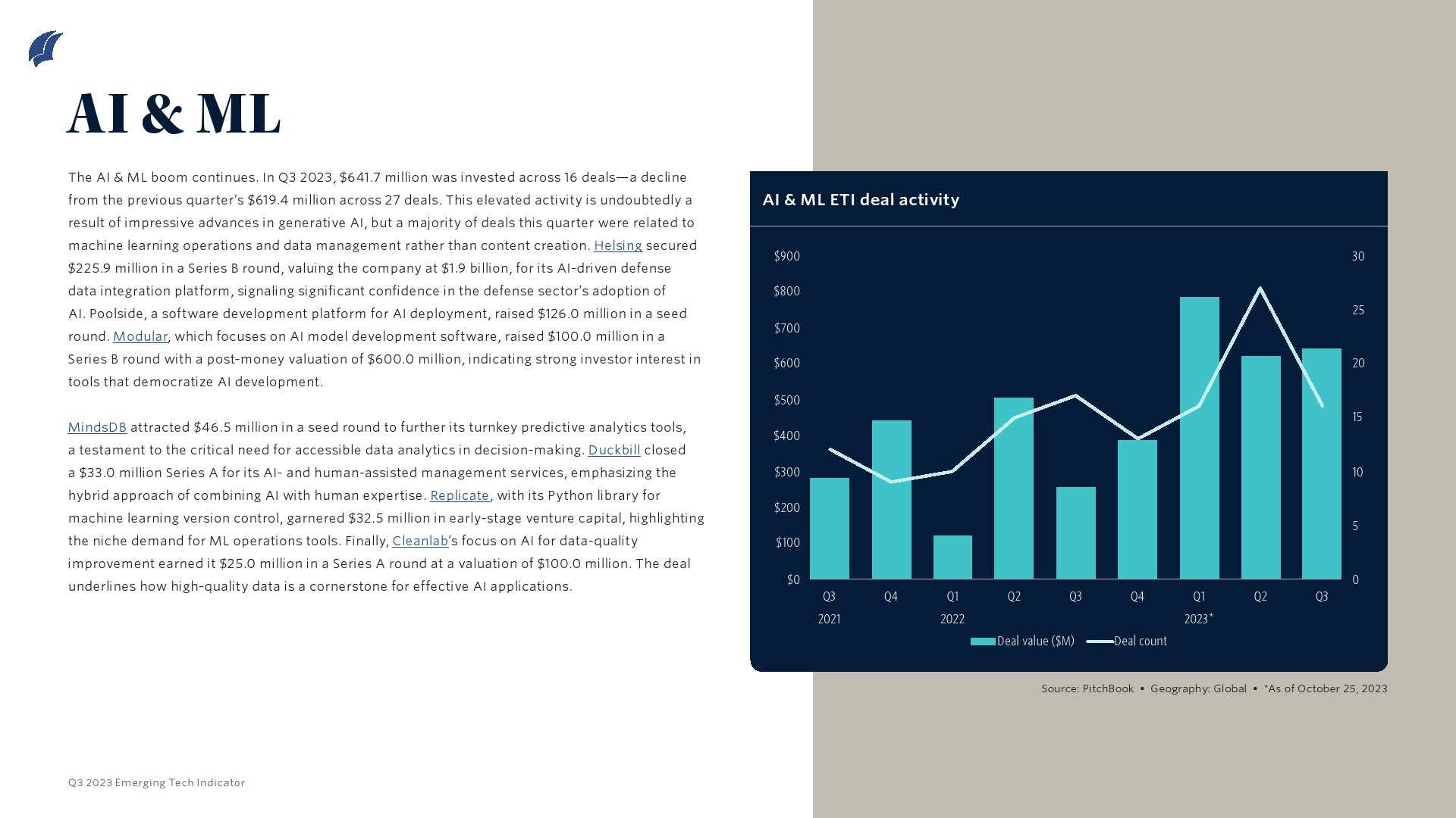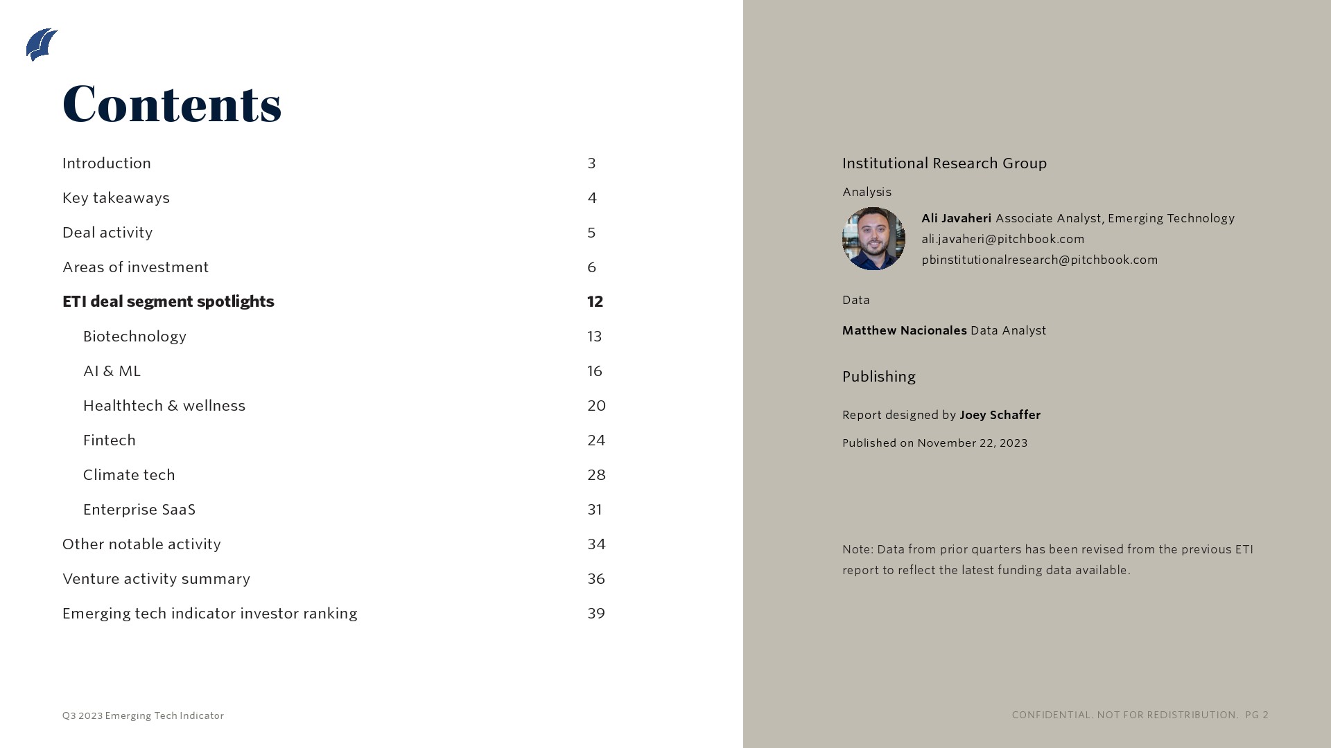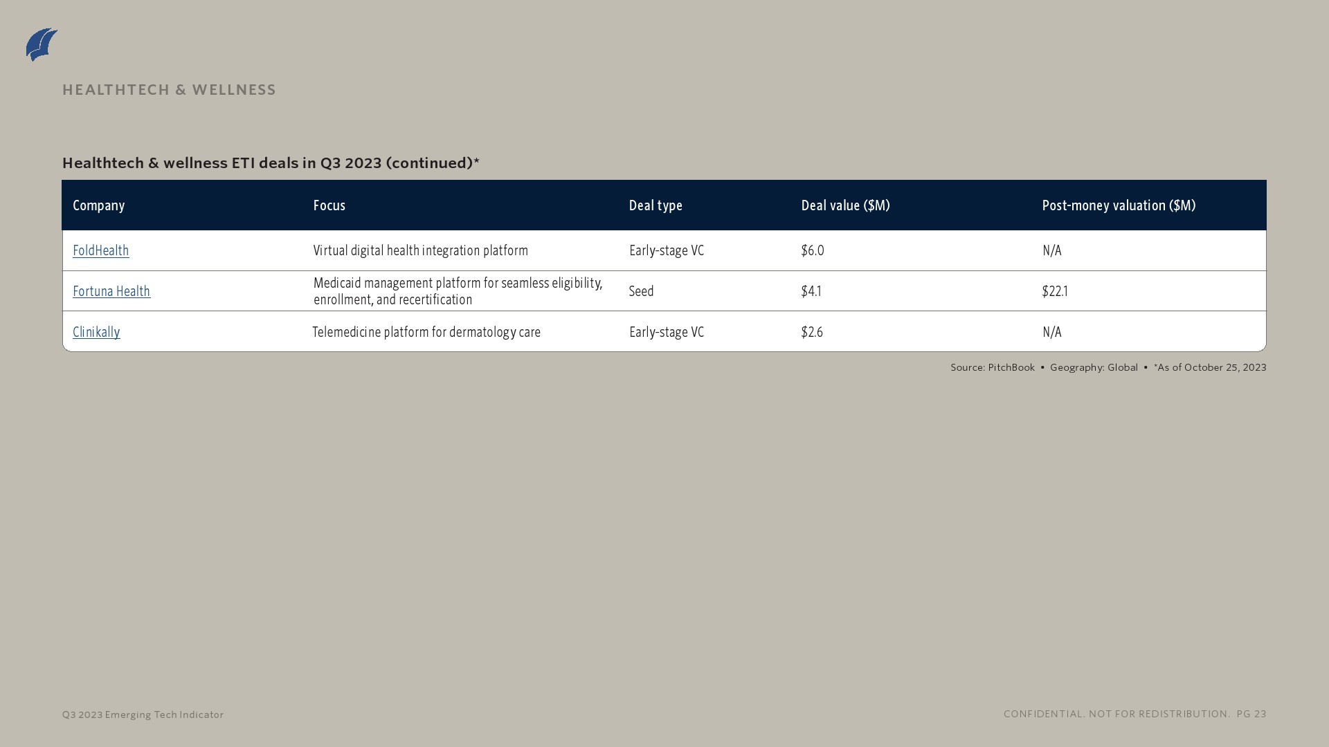 交易活动继续下降:自2022年初以来的广泛下降,2023年第三季度,新兴科技交易活动从上一季度的143笔交易(投资额34亿美元)下降到124笔(30亿美元)。与2022年第一季度的峰值相比,交易数量下降了73.2%,投资额下降了56.3%。新兴科技交易占本季度所有天使、种子和早期风险投资的10.7%,与上一季度保持一致,也与历史平均水平(10.4%)保持一致。