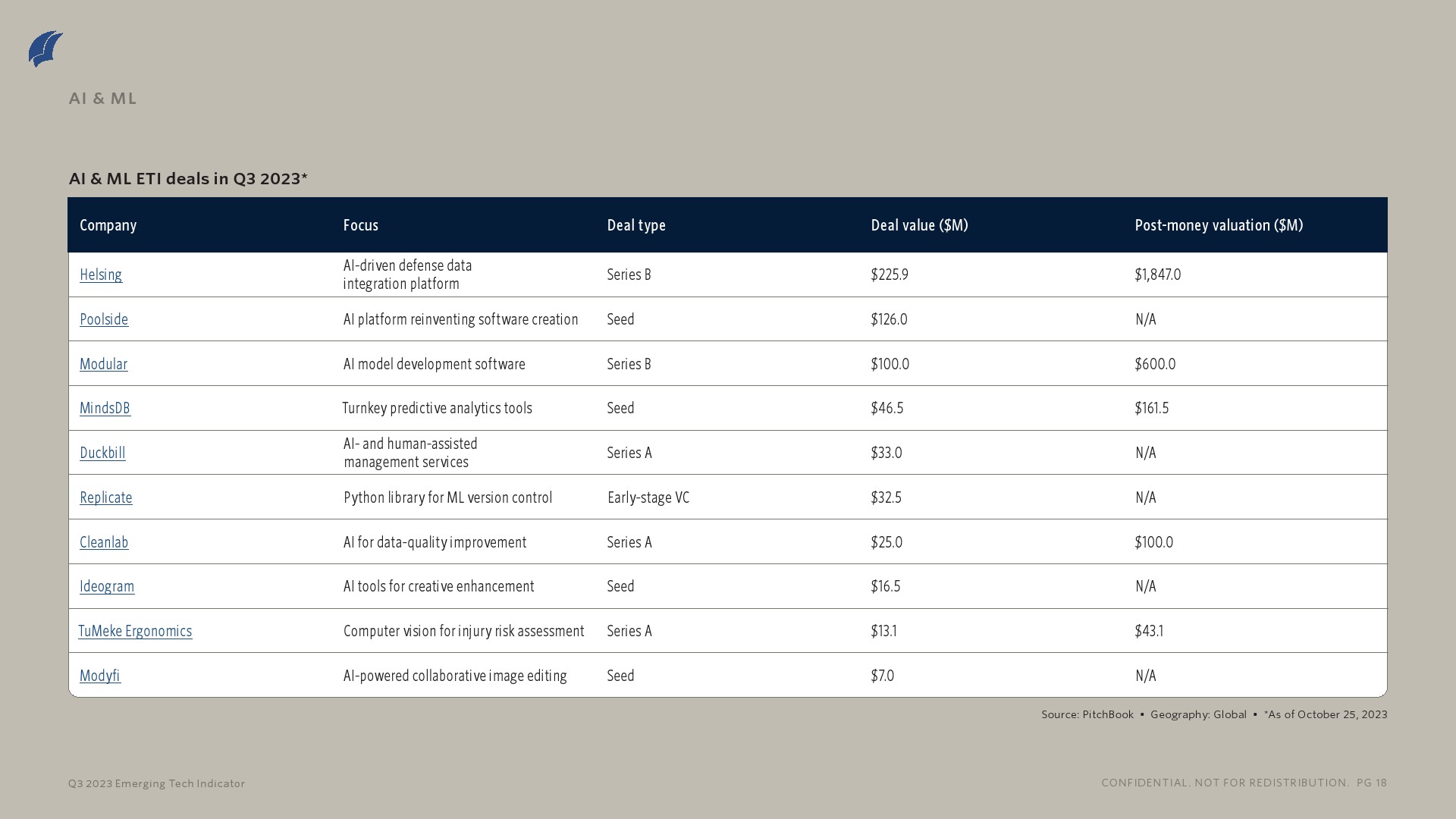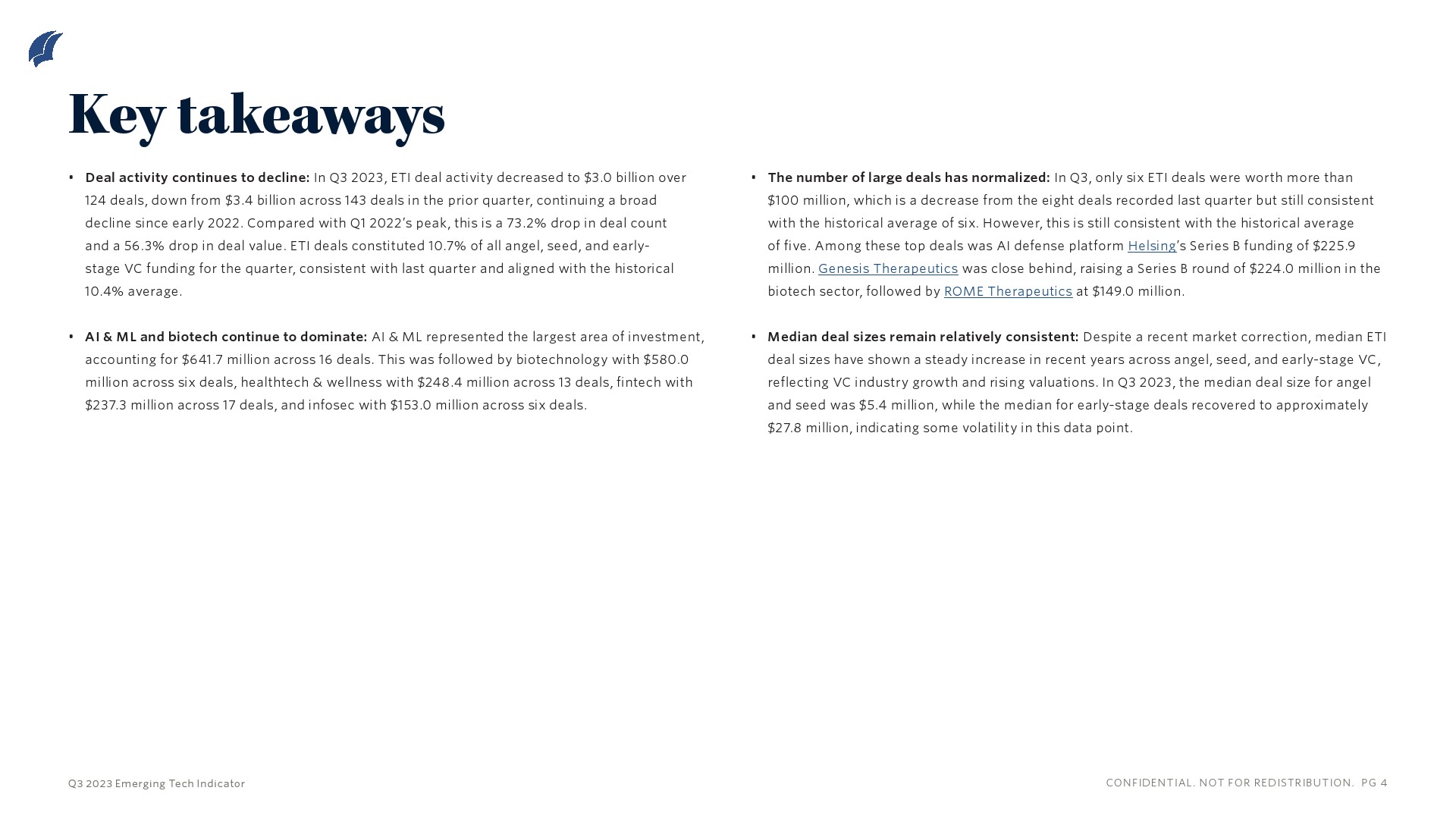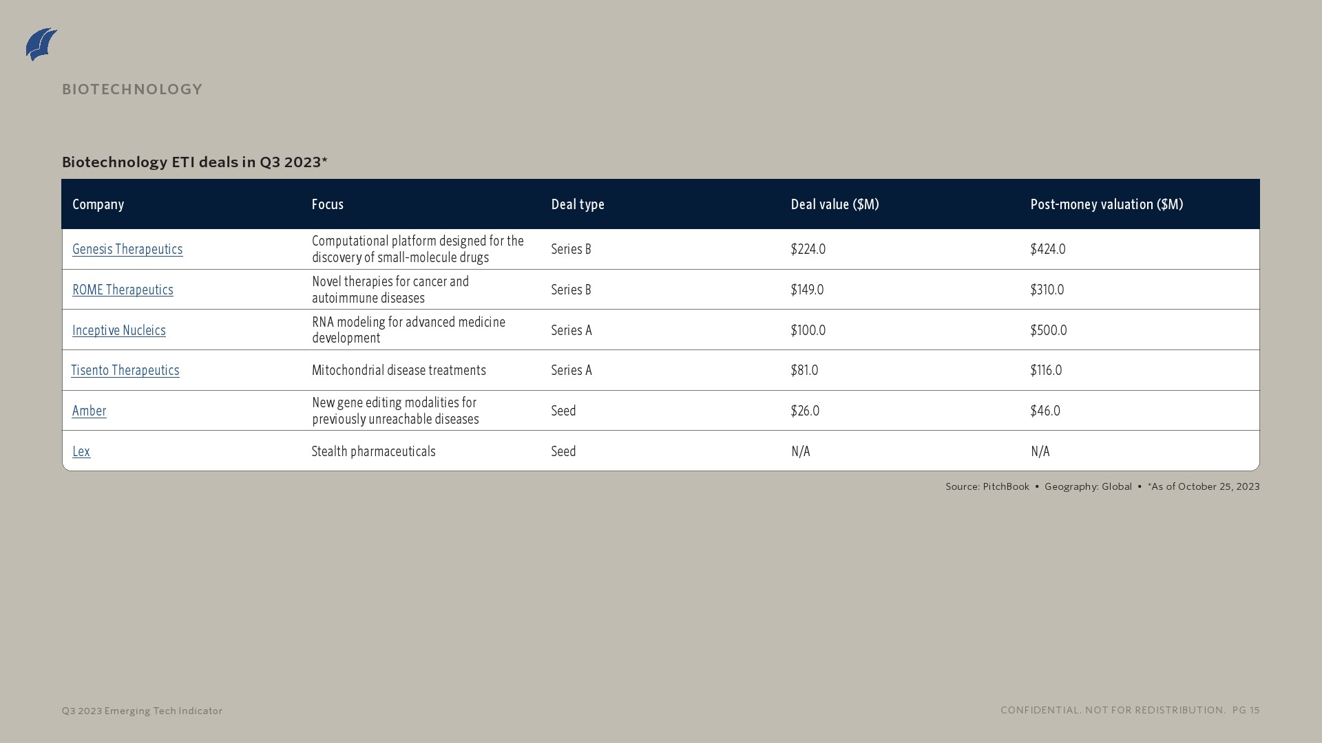 大型交易的数量已趋于正常化:第三季度,只有6笔新兴科技交易的价值超过1亿美元,比上一季度的记录(8笔)有所减少,但仍与历史平均水平(6笔)保持一致。在这些顶级交易中,人工智能防御平台Helsing完成了2.259亿美元的B轮融资。Genesis Therapeutics紧随其后,完成了价值2.24亿美元的B轮融资,ROME Therapeutics获得了1.49亿美元投资。