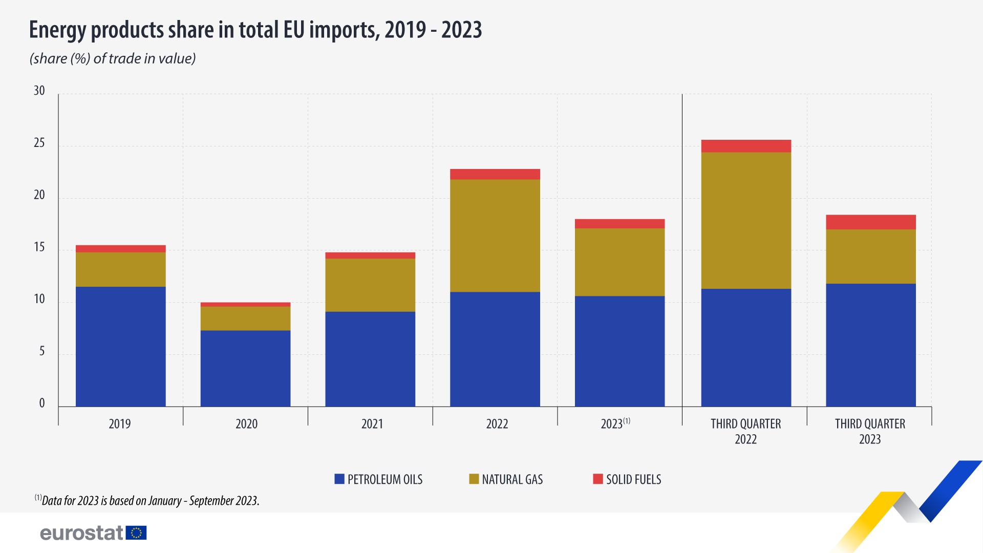 2023年第三季度,能源产品进口占欧盟进口总额的17.7%。从2019年到2023年,这一份额出现了较大波动,主要原因是能源产品价格的大幅波动。