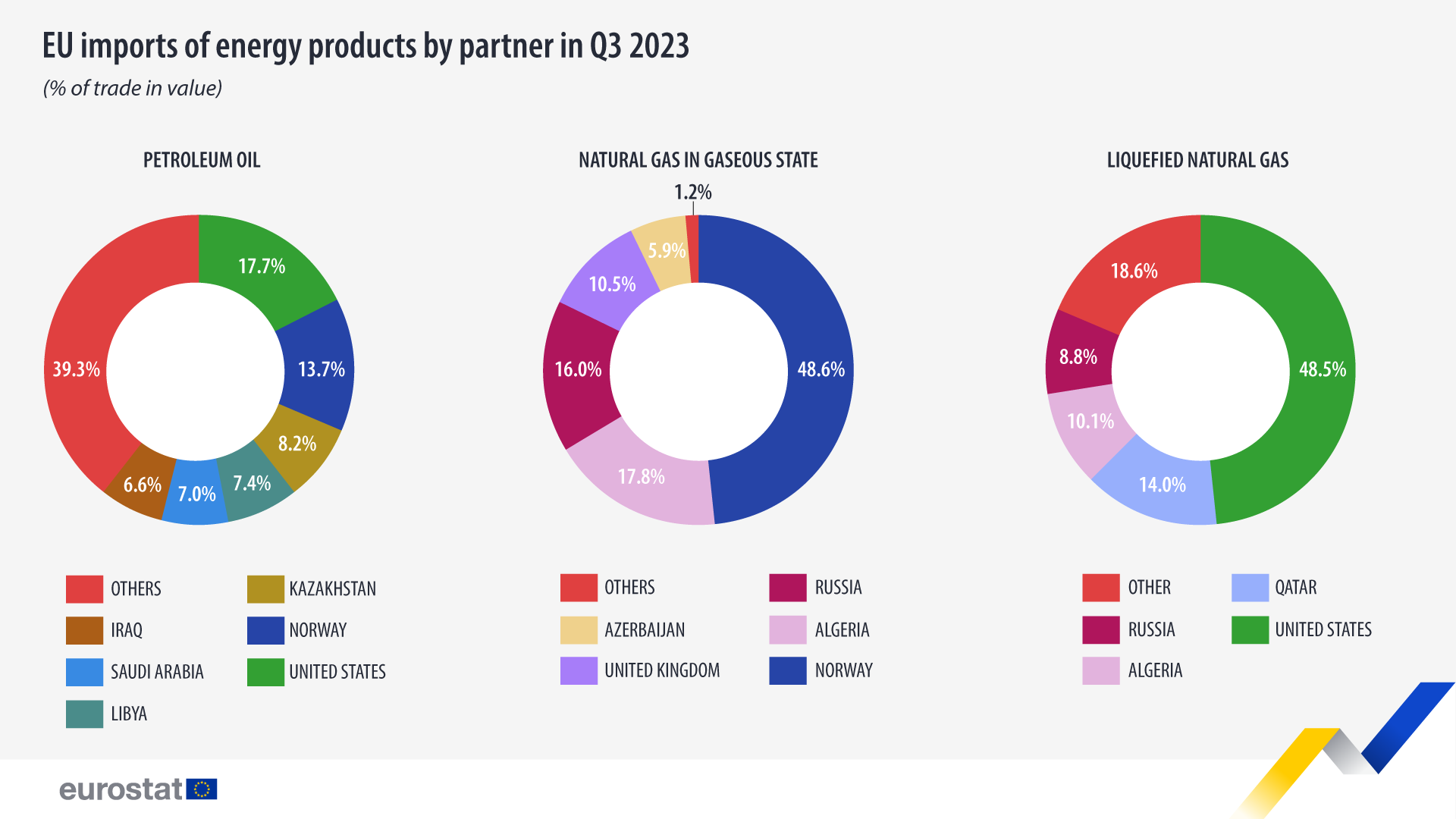 几乎一半的气态天然气来自挪威(48.6%)。阿尔及利亚紧随其后,占17.8%,领先于俄罗斯(16.0%)和英国(10.5%)。