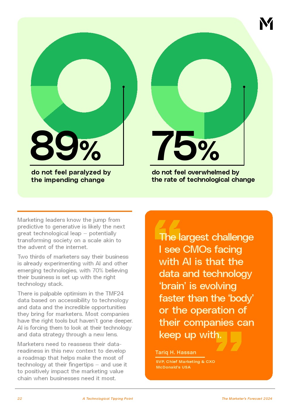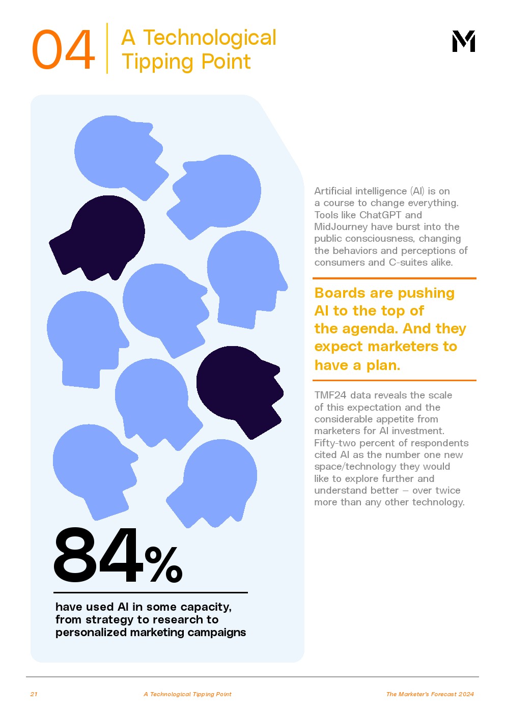 营销领导者是人工智能提出的许多大胆问题的核心,关注生产力、消费者体验和增长。84%的受访者在某种程度上使用了人工智能,但他们必须考虑即将到来的监管和政策影响。许多国家仍然需要制定路线图。