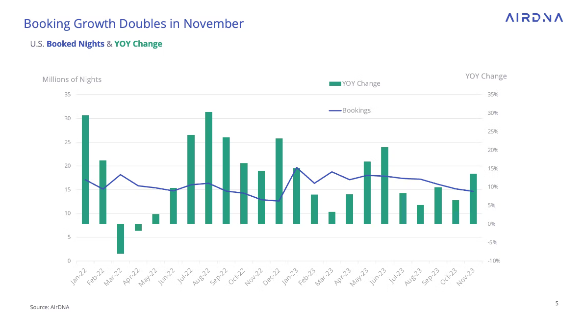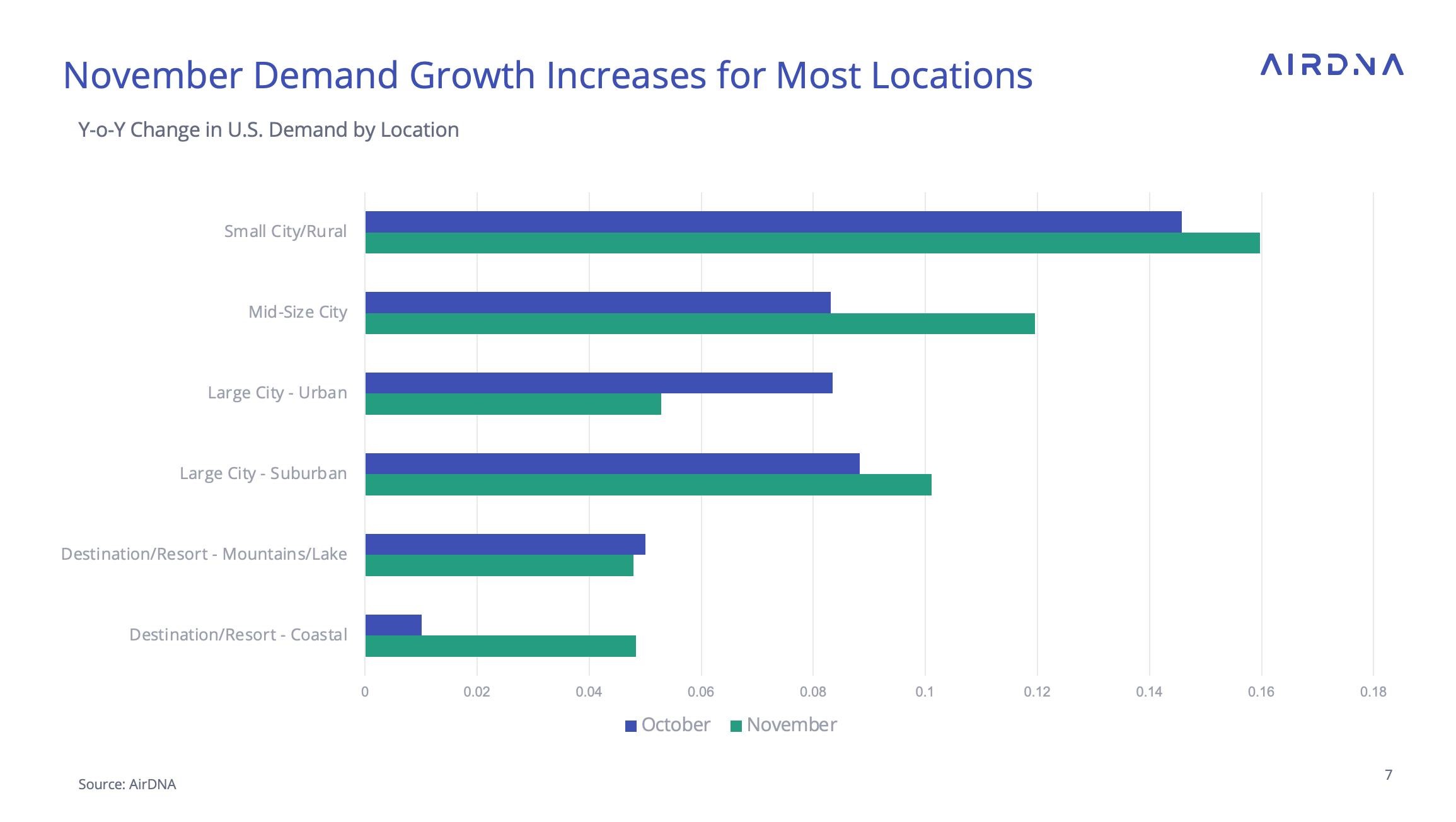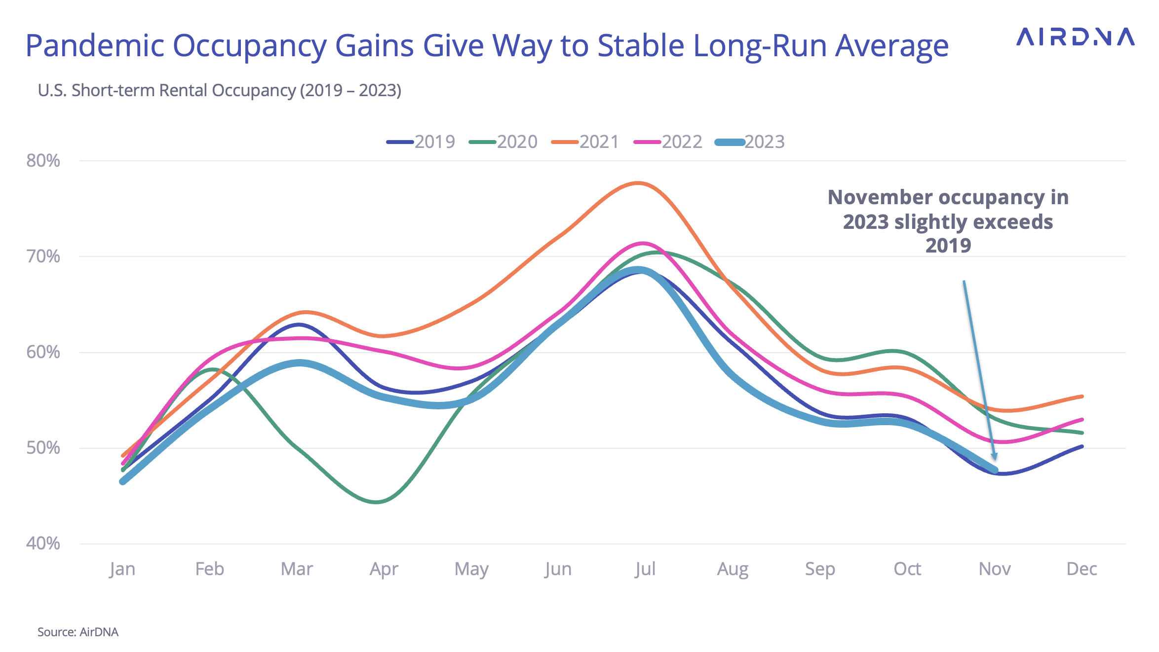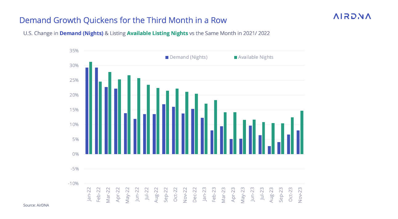 11月,美国短期租赁(STR)需求连续第三个月加速增长,这表明旅行者已经在为一个繁忙的春季做准备。尽管与过去几年的业绩高点相比有所下降,但11月业绩的提升使入住率基本与大流行前的水平持平,未来一年STR市场有望保持适度和平衡。