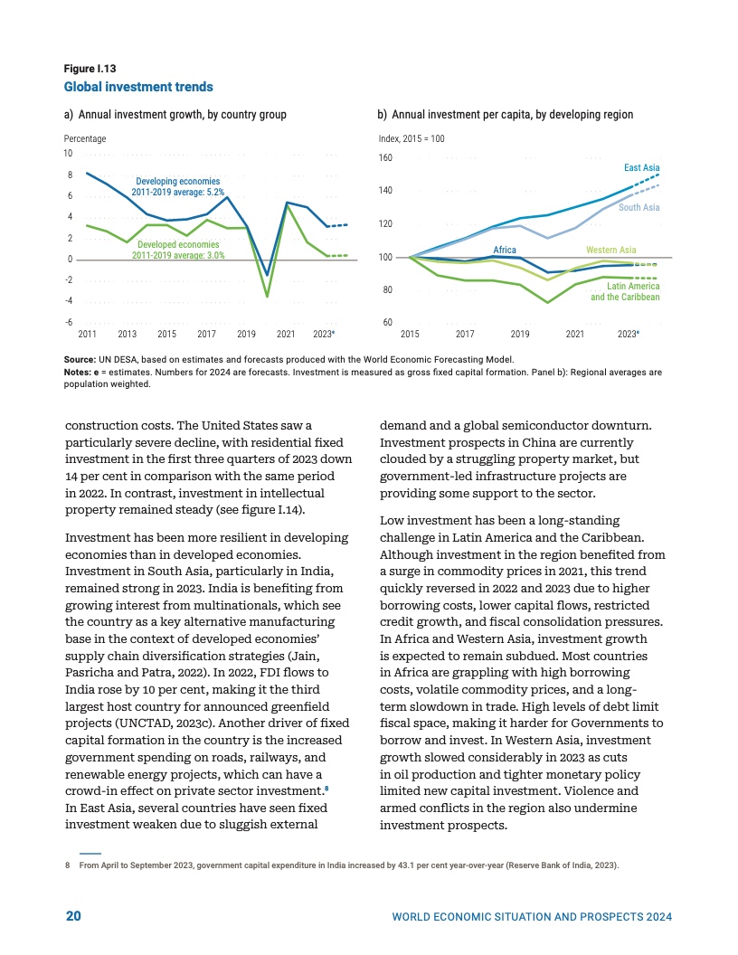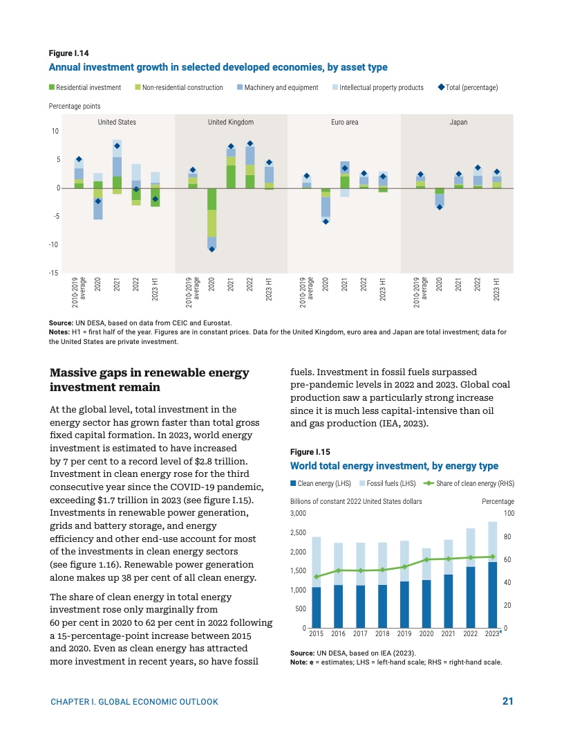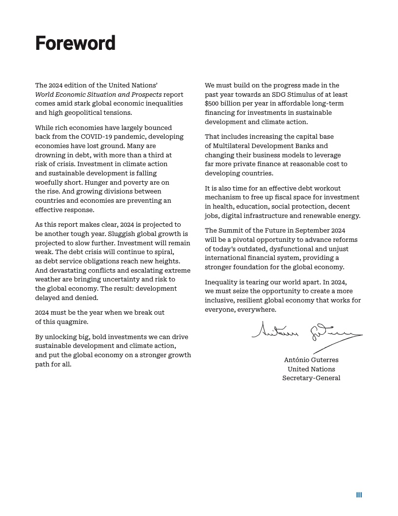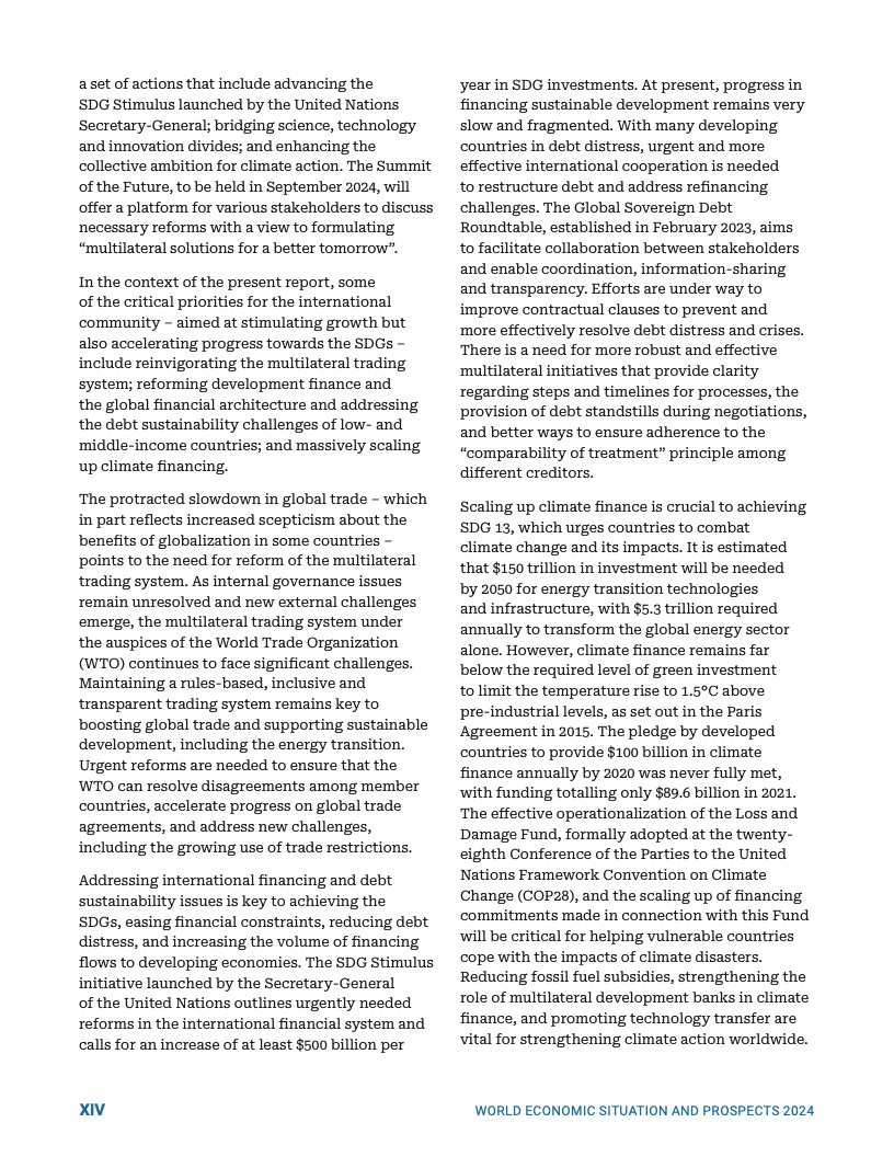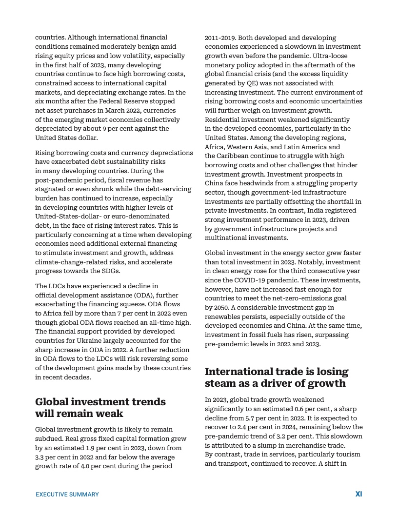 报告分析称,2023年全球经济表现超出预期,但这掩盖了短期风险和结构脆弱性问题。在世界经济负债累累的情况下,还需要更多投资以恢复增长、应对气候变化、加速实现可持续发展目标;而长期信贷条件紧缩及借贷成本增高的前景,对加大投资造成了严重阻碍。